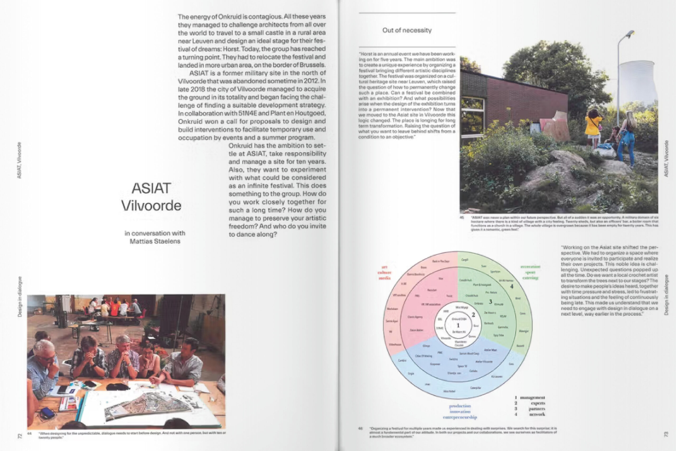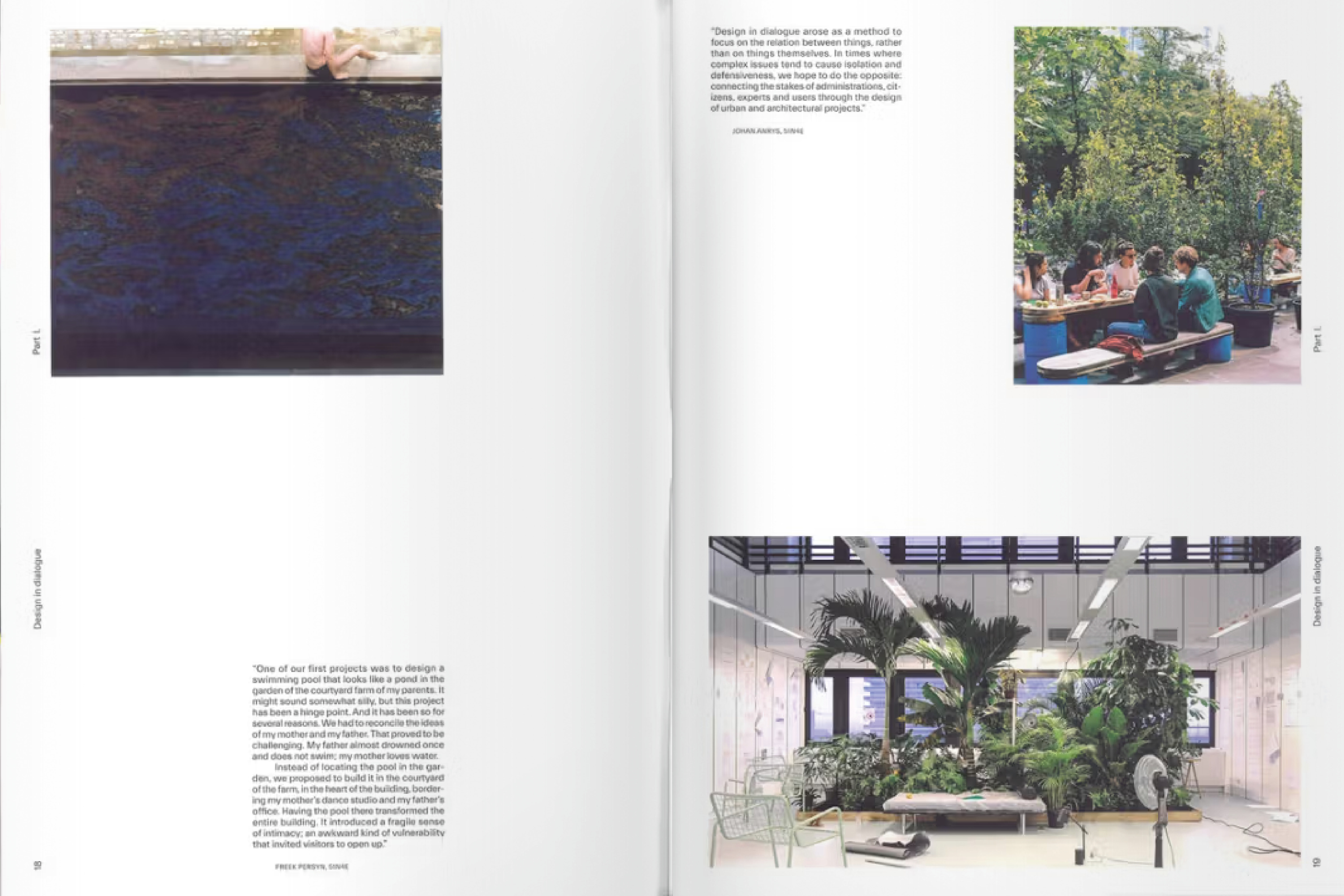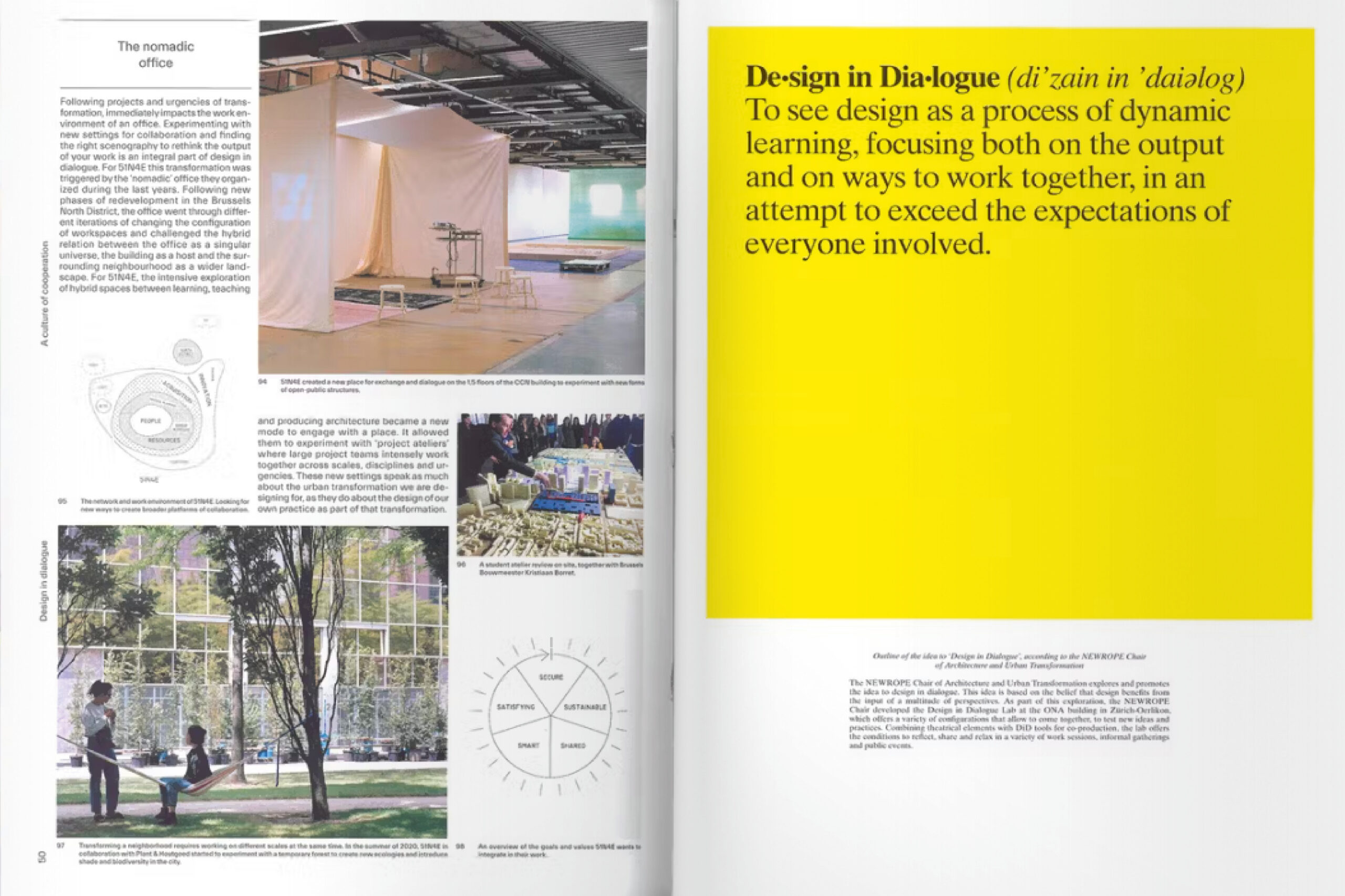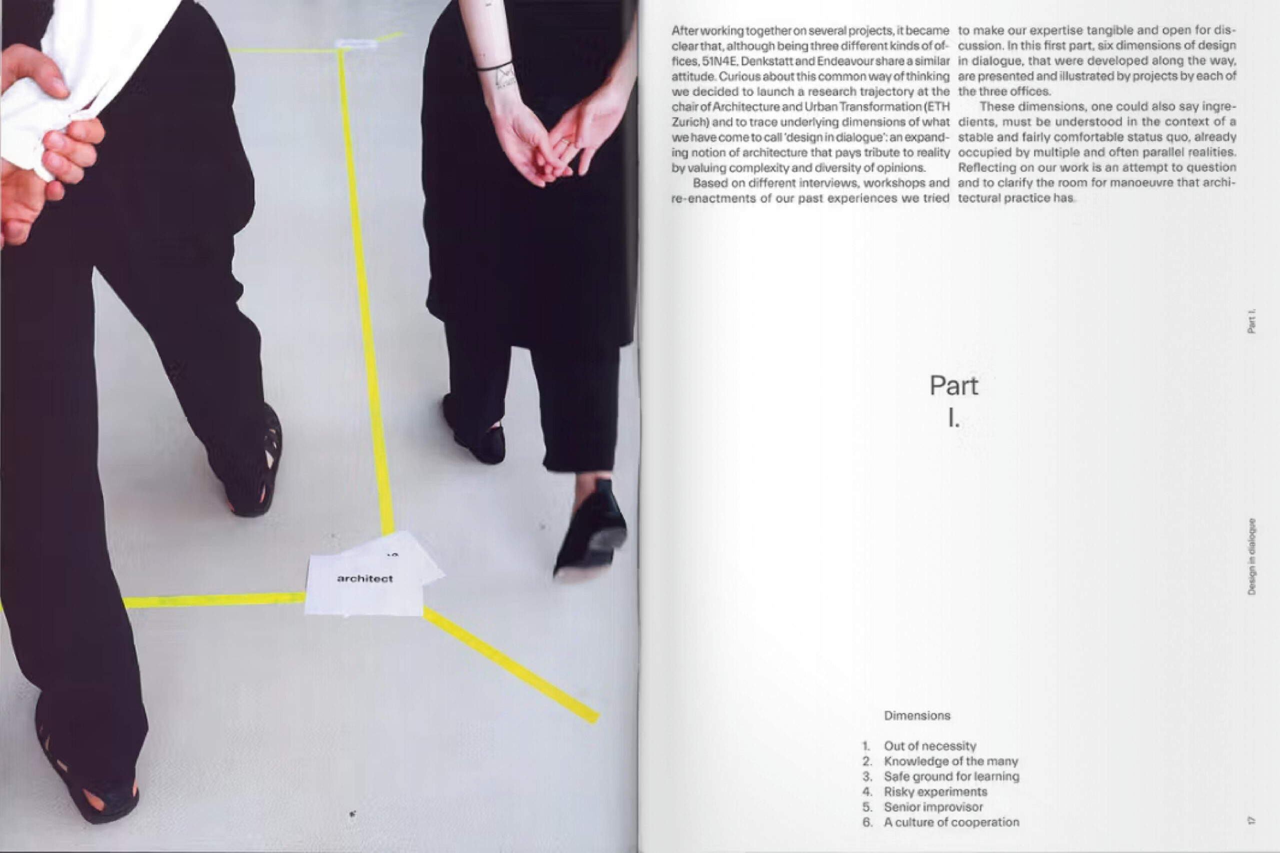 In seinem ersten Teil untersucht Design in Dialogue die Arbeit des Brüsseler Architekturbüros 51N4E, des Antwerpener Büros für sozial- räumliche Innovation endeavour und des Baseler Büros für urbane Transformation Denkstatt. Alle drei Büros loten die Grenzen der architektonischen Praxis aus und stellen das Selbstverständnis von Architekten und Stadtgestaltern in Frage, denen es oft mehr um Autonomie und Monolog als um Offenheit und Dialog geht. Obwohl sich die drei Büros radikal unterscheiden, schätzen sie alle den Wert von Design im Dialog.