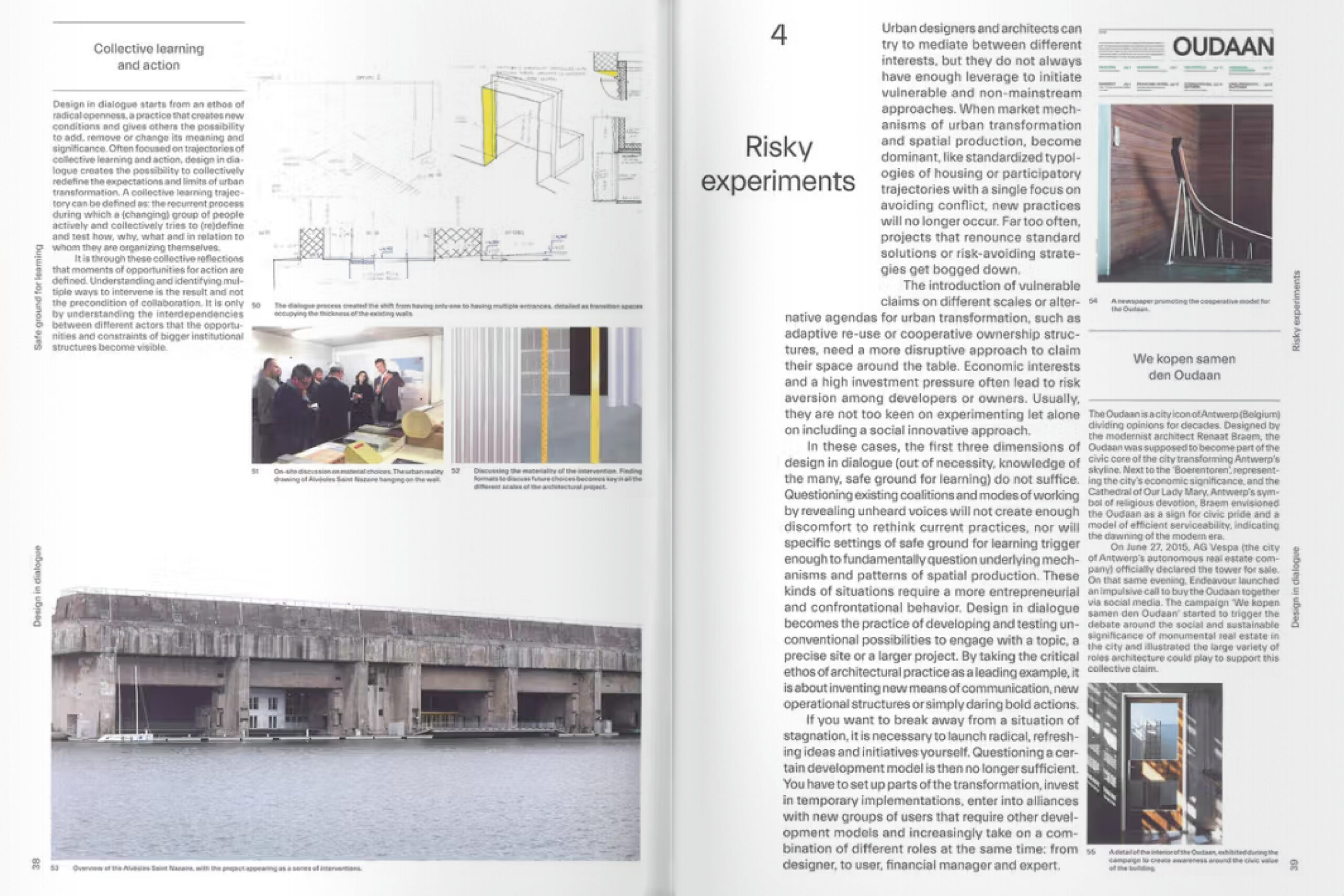 A second part of the publication examines the hidden presence of this design in dialogue approach in a wide range of European architecture firms and their projects — not as a new methodology to study, but as a liberating attitude to share, cherish, and develop. Reflecting on these undertakings illustrates the way design in dialogue can create a productive momentum and foster engagement. With projects by Harder Haas, Atelier Bow-Wow, Lacol, Studio Paola Viganò, Equip 10+1, Onkruid, Caruso St John Architects, and Communitism.