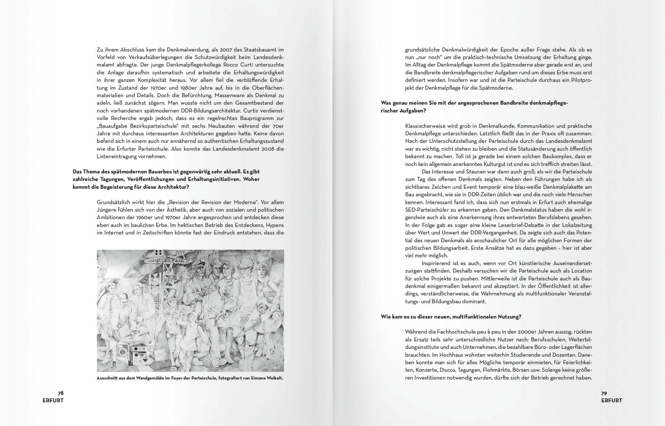 Die Gestalt dieser Architekturen wird durch den kulturellen Zeitgeist bestimmt – ein komplexes Zusammenspiel gesellschaftlicher Prozesse, politischer Zielstellungen und praktischer Organisation. Fortschrittsoptimismus und gesellschaftliche Aufbaubestrebungen prägen die Gestaltung dieser Gebäude. In starkem Kontrast zum einstigen Anspruch der Architekten steht dabei die heutige Kritik an baukonstruktiv-klimatischen Problemen und ästhetischen Aspekten dieser Architekturepoche und ihrer Bauten. Die Beiträge im Buch zeigen aber: Zwischen Politik und Ästhetik beweist die Architektur dieser Zeit gerade im heutigen Gebrauch Qualitäten.