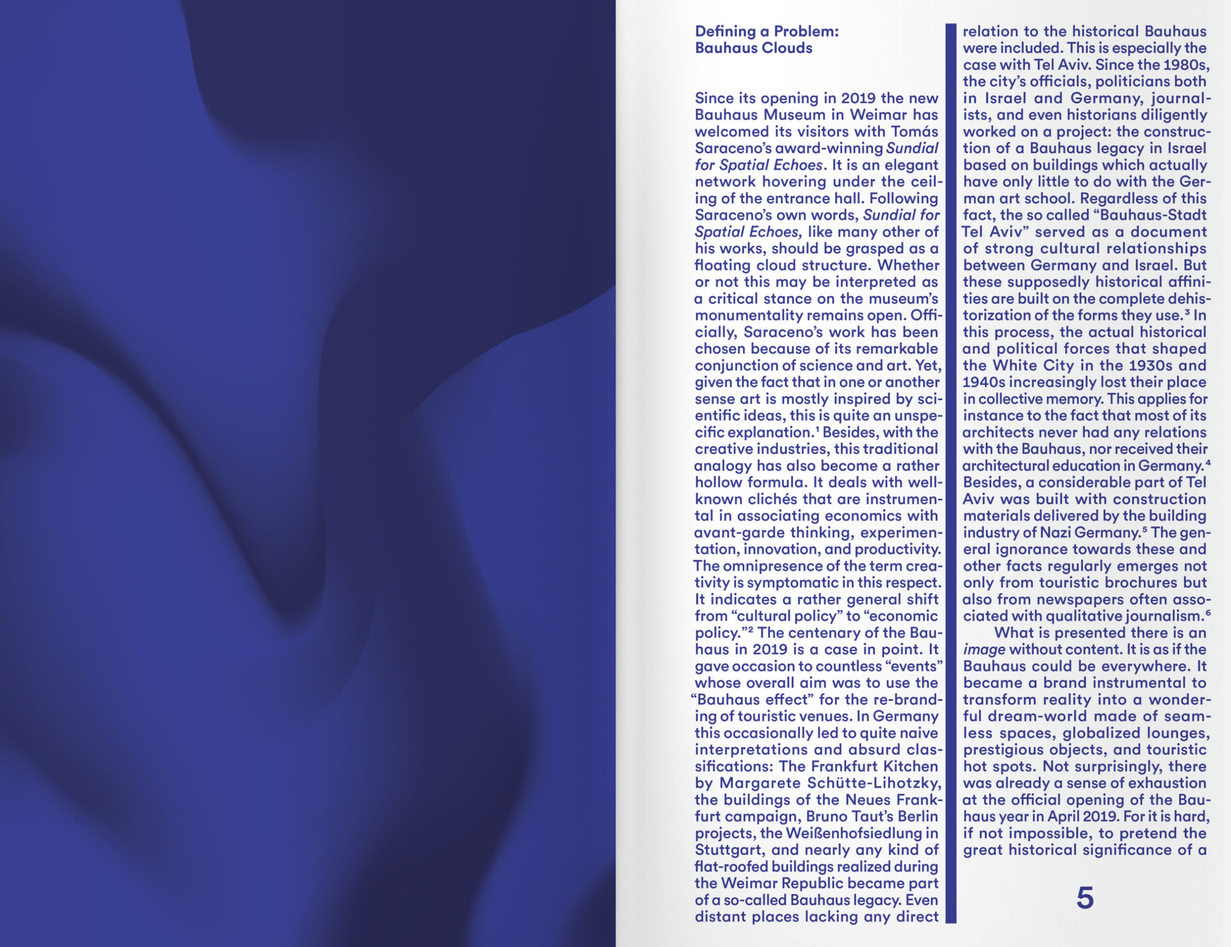 Bauhaus Clouds nimmt solche Ansätze als Ausgangspunkt zum Handeln. Das Buch befasst sich einerseits mit den Konstrukten neuer Narrative, die Architekturarchive in den Mittelpunkt der Bauhaus-Debatten stellen. Es geht davon aus, dass Archive und Architektursammlungen weder festgeschriebene noch neutrale Aussagen sind. Andererseits untersucht es, inwieweit architektonische Narrative und Maßnahmen, die die Idee des Bauhauses beeinflussen, die sozialen Konstrukte vergangener Erfahrungen im aktuellen Prozess der Architekturkultur sowie die Beziehung der Gesellschaft zur Baukultur im Allgemeinen geprägt haben.