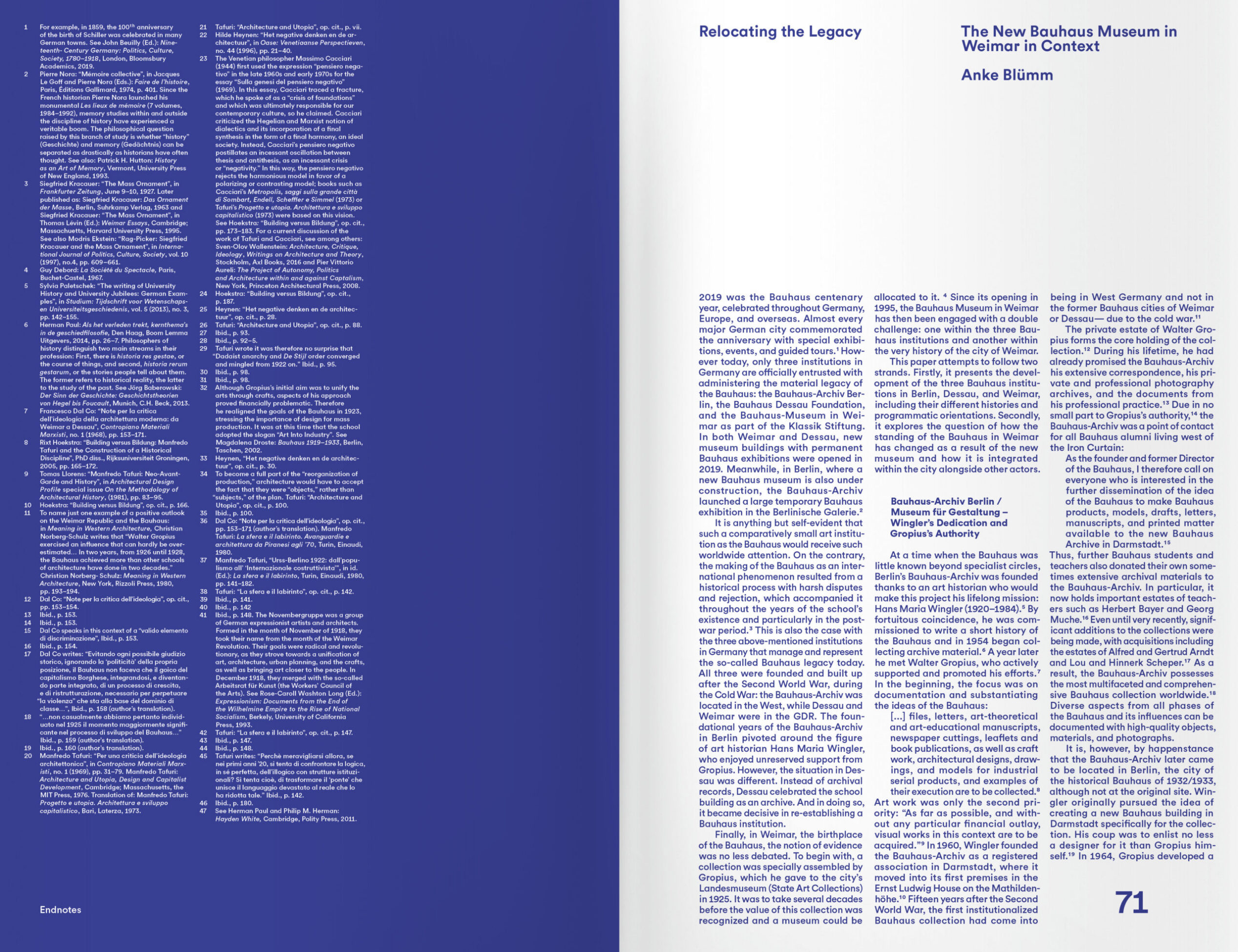 The Bauhaus as we know it did not exist. It is actually a complex of clichés, unilateral interpretations, ideological appropriations, misunderstandings, tendentious receptions, and historical narratives. Not surprisingly, it was celebrated as the most important art school of modernity’s heroic age, while simultaneously documenting quite the opposite: the degeneration of art and architecture in the age of capitalism.