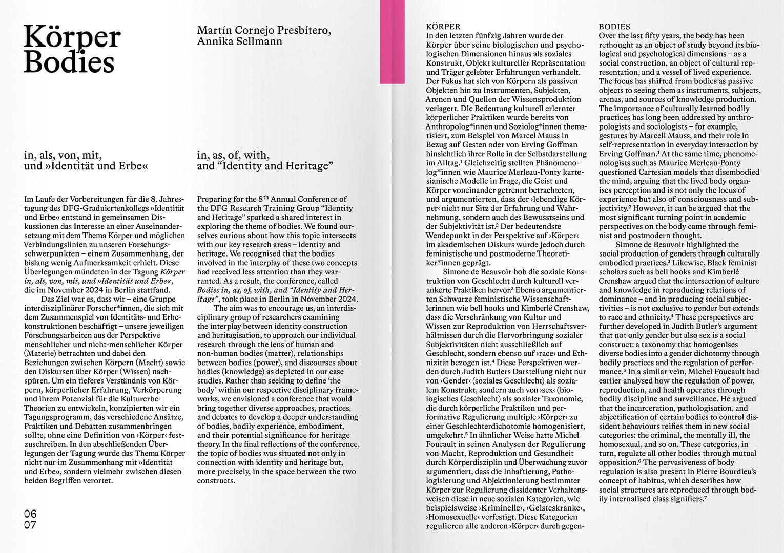 Mit dem Titel Bodies in, as, of, with, and ‘Identity and Heritage’ verweist der VII. Band der Schriftenreihe des DFG-Graduiertenkollegs Identität und Erbe auf die vielfältigen Relationen in denen Körper-Konzepte zur Theoriebildung beitragen. Aspekte wie Verletzlichkeit und Emotion; Aneignung, Disziplinierung und Kontrolle; Verfall und Revitalisierung werden anhand von interdisziplinären Fallbeispielen beschrieben und sollen zu einem näheren Verständnis des Zusammenhangs von Körper zu Identität- und Erbekonstruktionen beitragen.