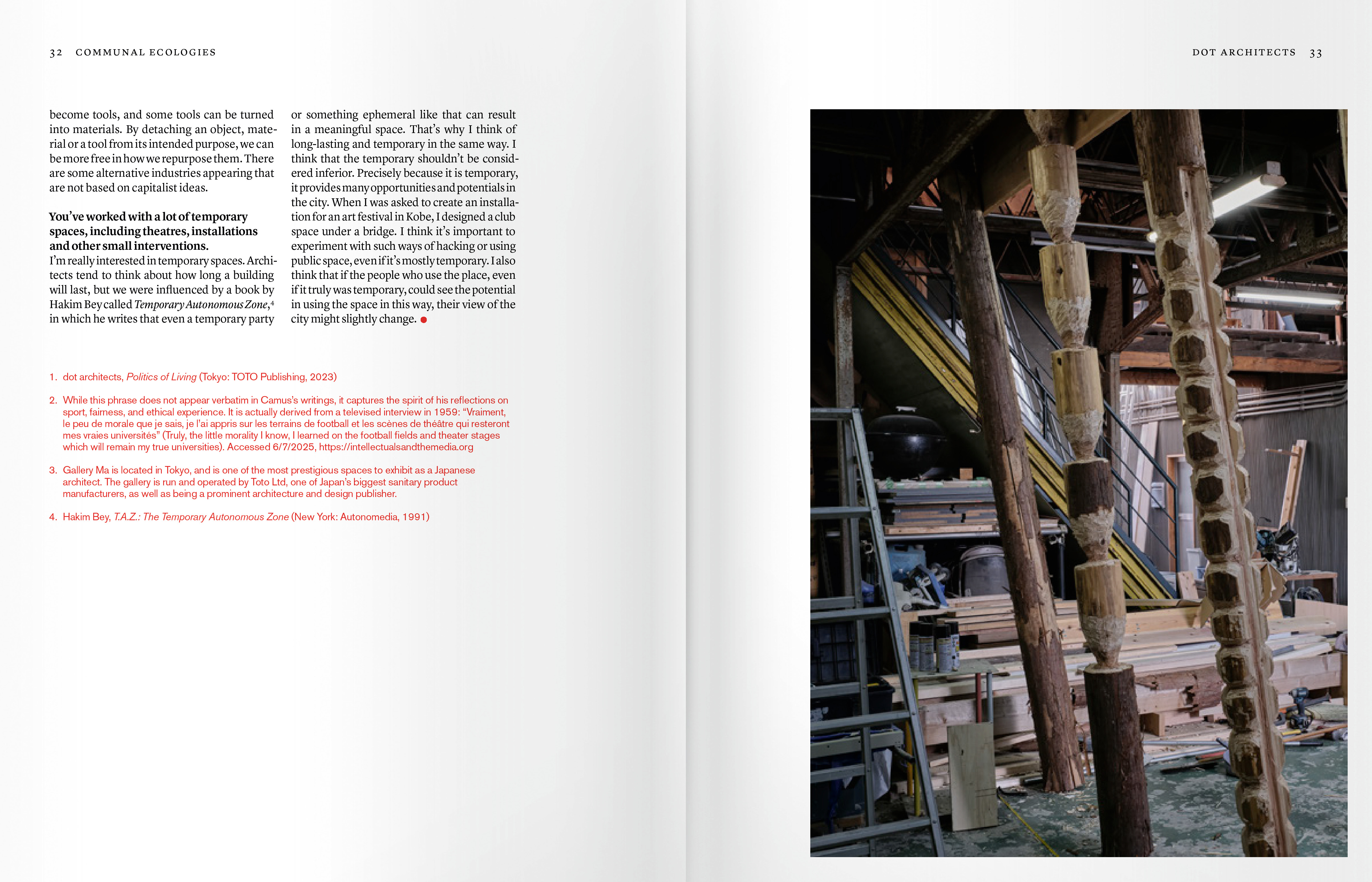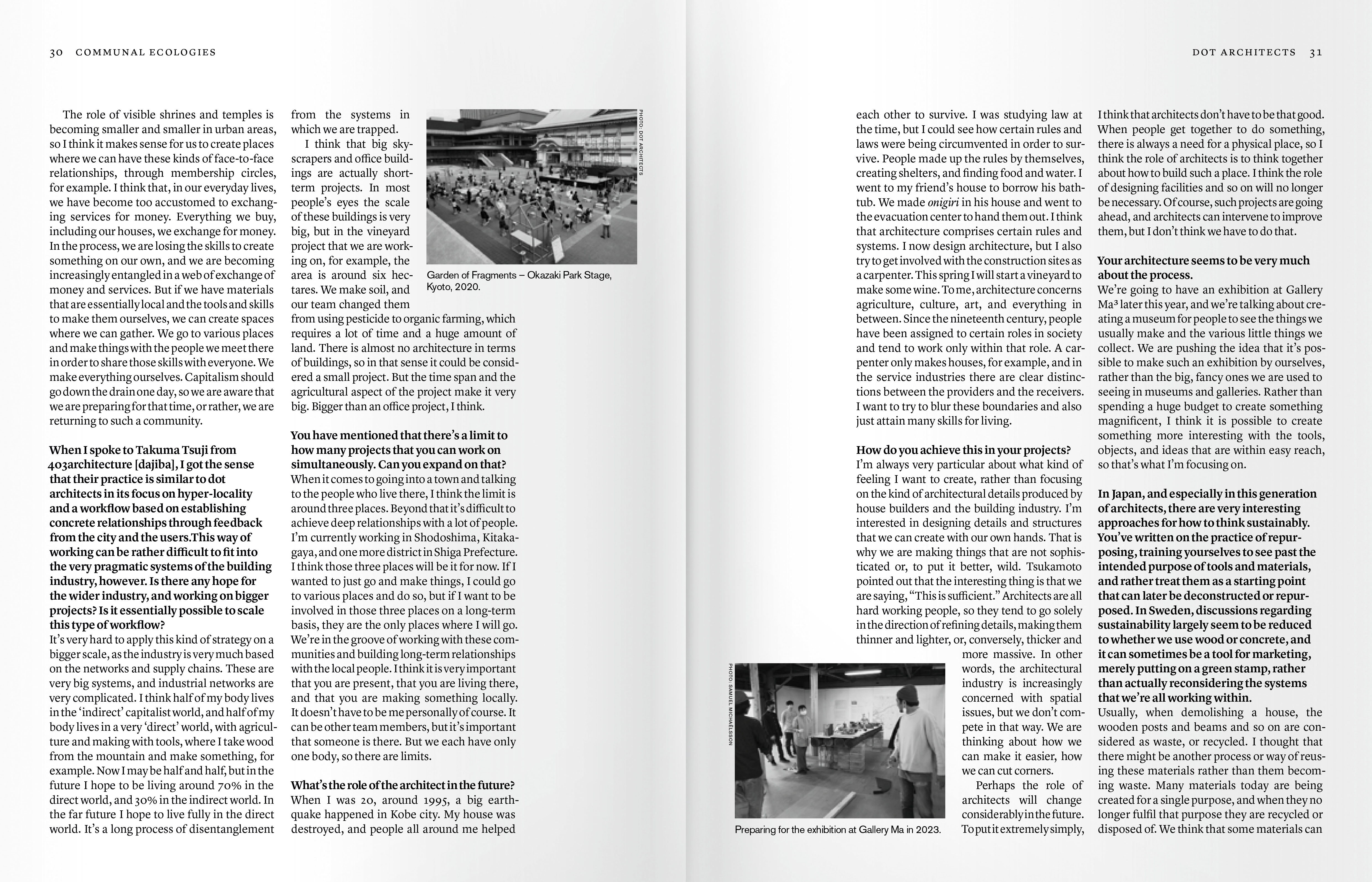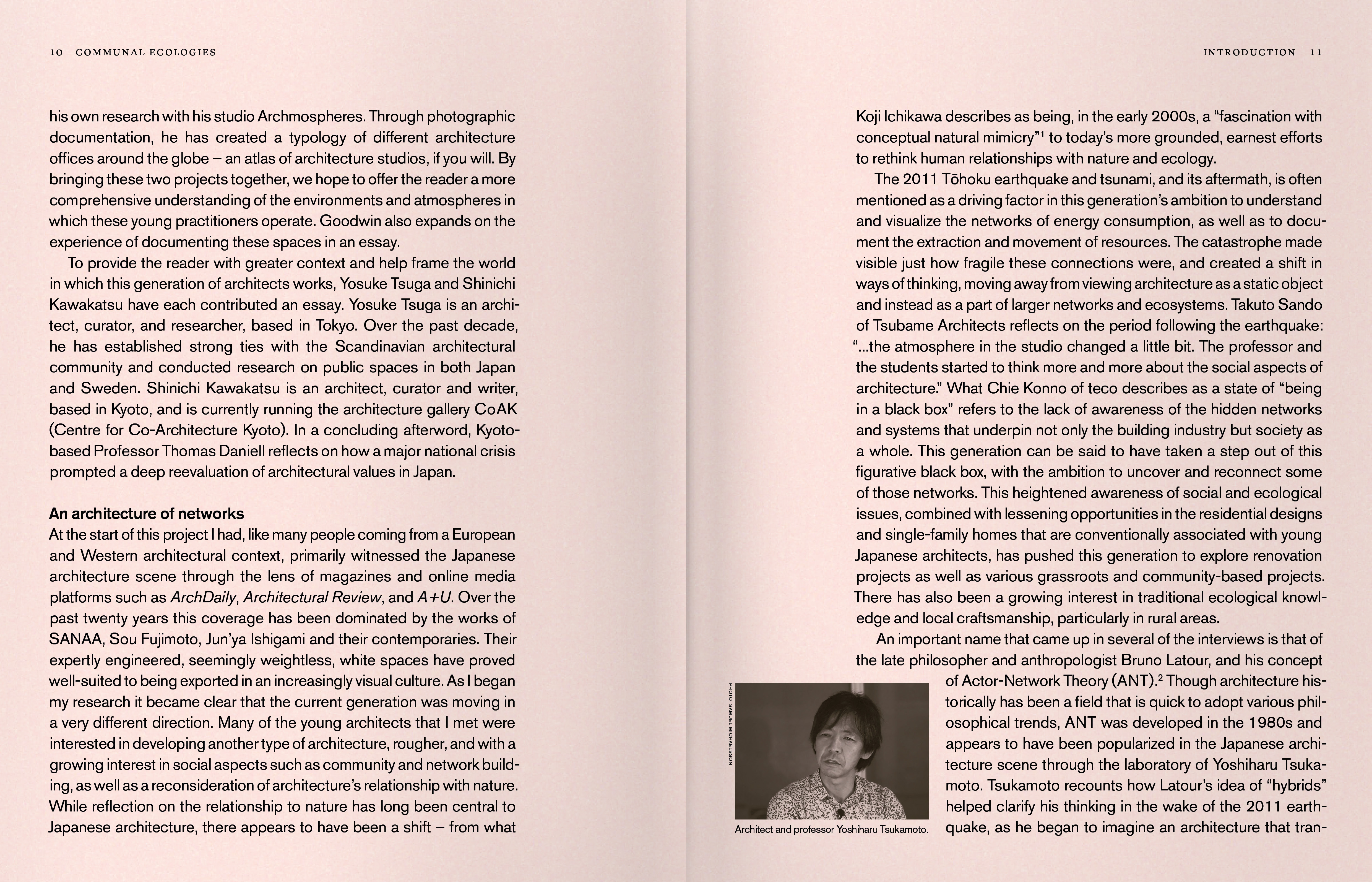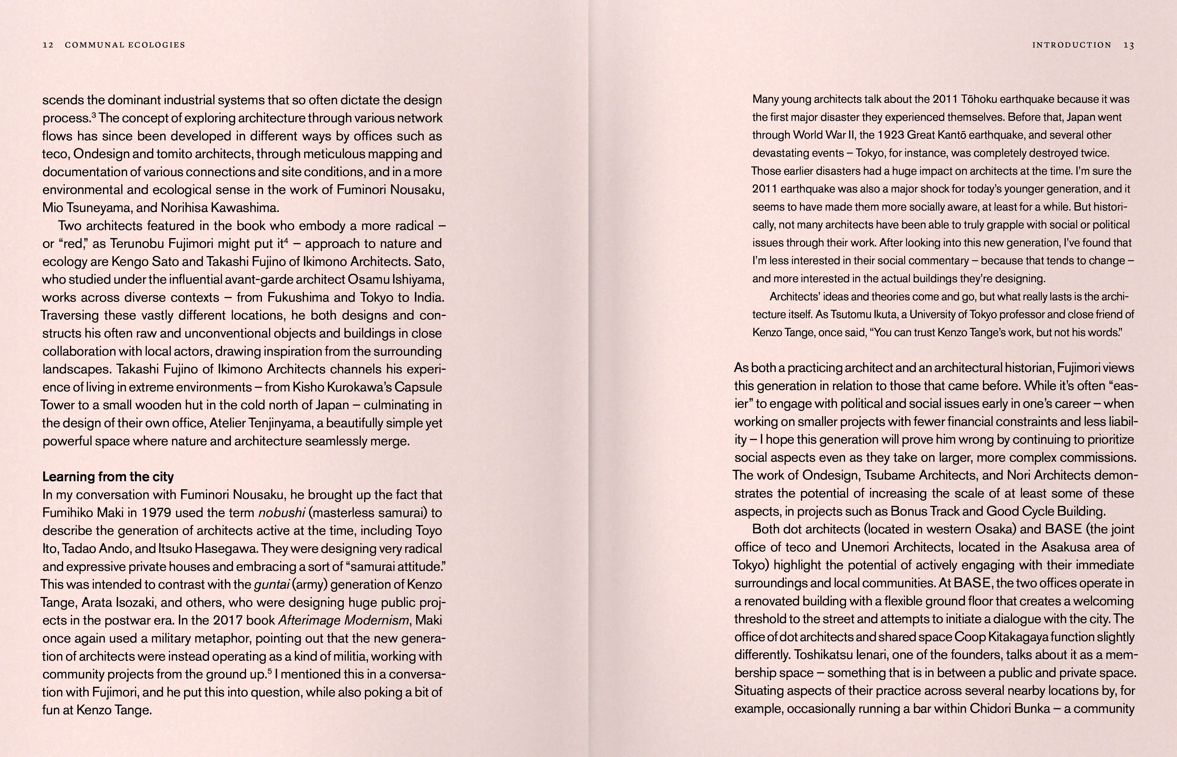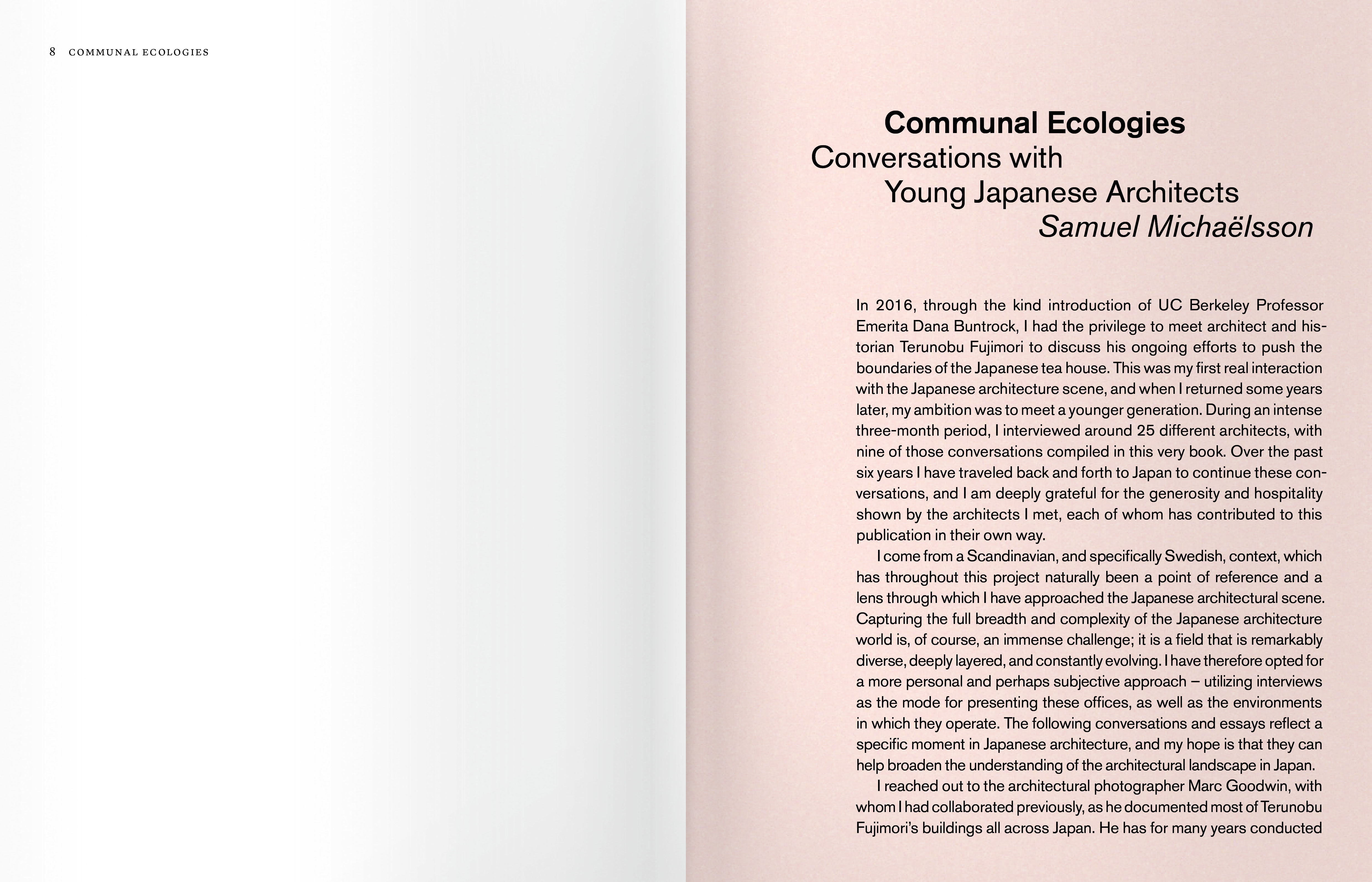 Communal Ecologies enthält eine Sammlung von Interviews, in denen prominente Persönlichkeiten dieser Generation vorgestellt werden, begleitet von Dokumentationen des Architekturfotografen Marc Goodwin sowie Essays von aufstrebenden japanischen Wissenschaftlern. Das Buch vermittelt ein frisches und differenziertes Verständnis der japanischen Architekturszene und deutet gleichzeitig das Potenzial an, die traditionelle Rolle von Architekt*innen zu hinterfragen.