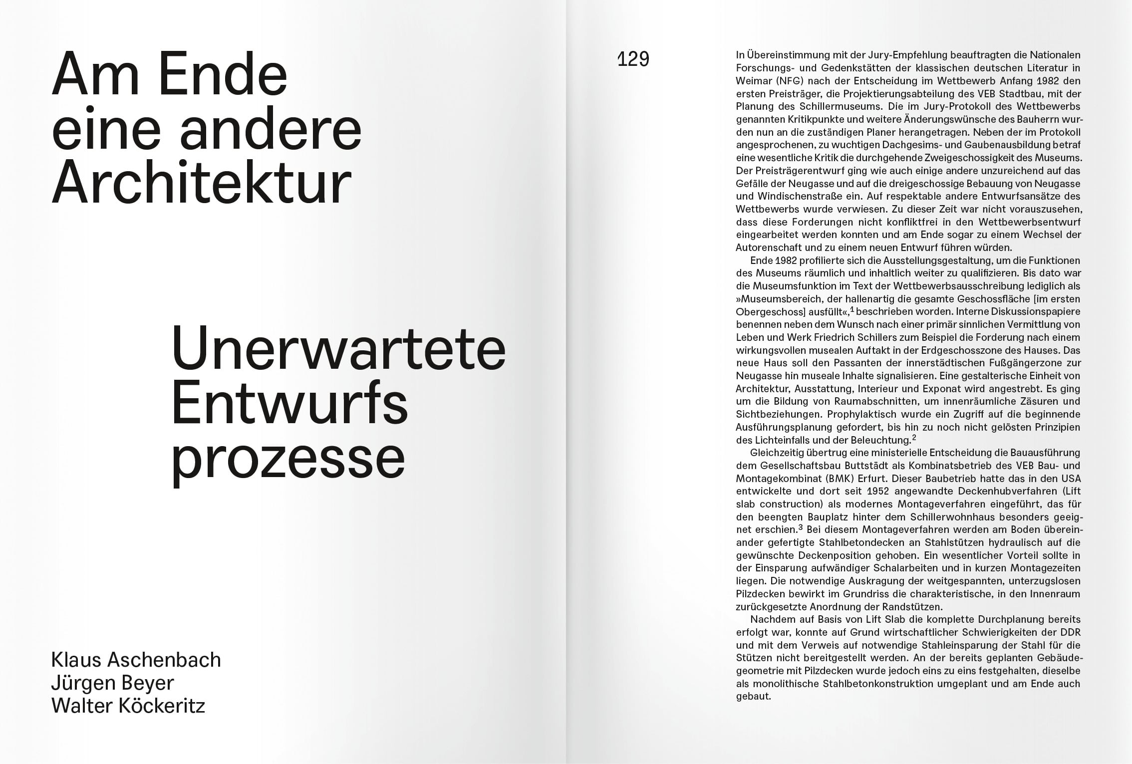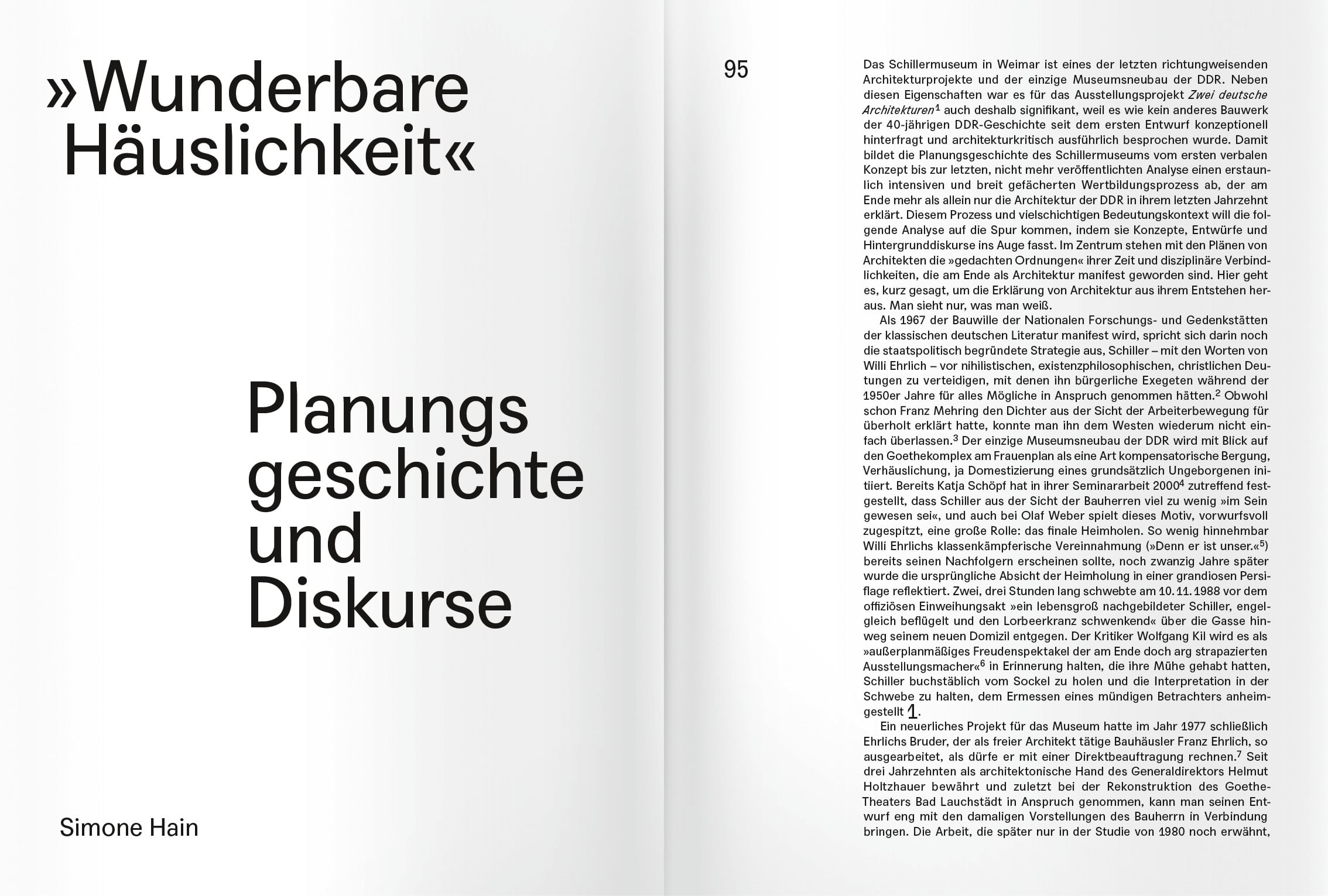 Das Schillermuseum in Weimar präsentiert erstmalig umfassend die Genese des Projekts, trägt bislang unbekanntes Archivmaterial zusammen und lässt zahlreiche Zeitzeugen zu Wort kommen. Neben der Dokumentation der Planungs- und Baugeschichte des Hauses selbst, sucht das Buch so auch nach einer Einordnung des Projekts in internationale Strömungen und thematisiert die Frage nach einer spezifischen (p)ostmodernen Sprache und diskursiven Architekturpraxis der DDR.