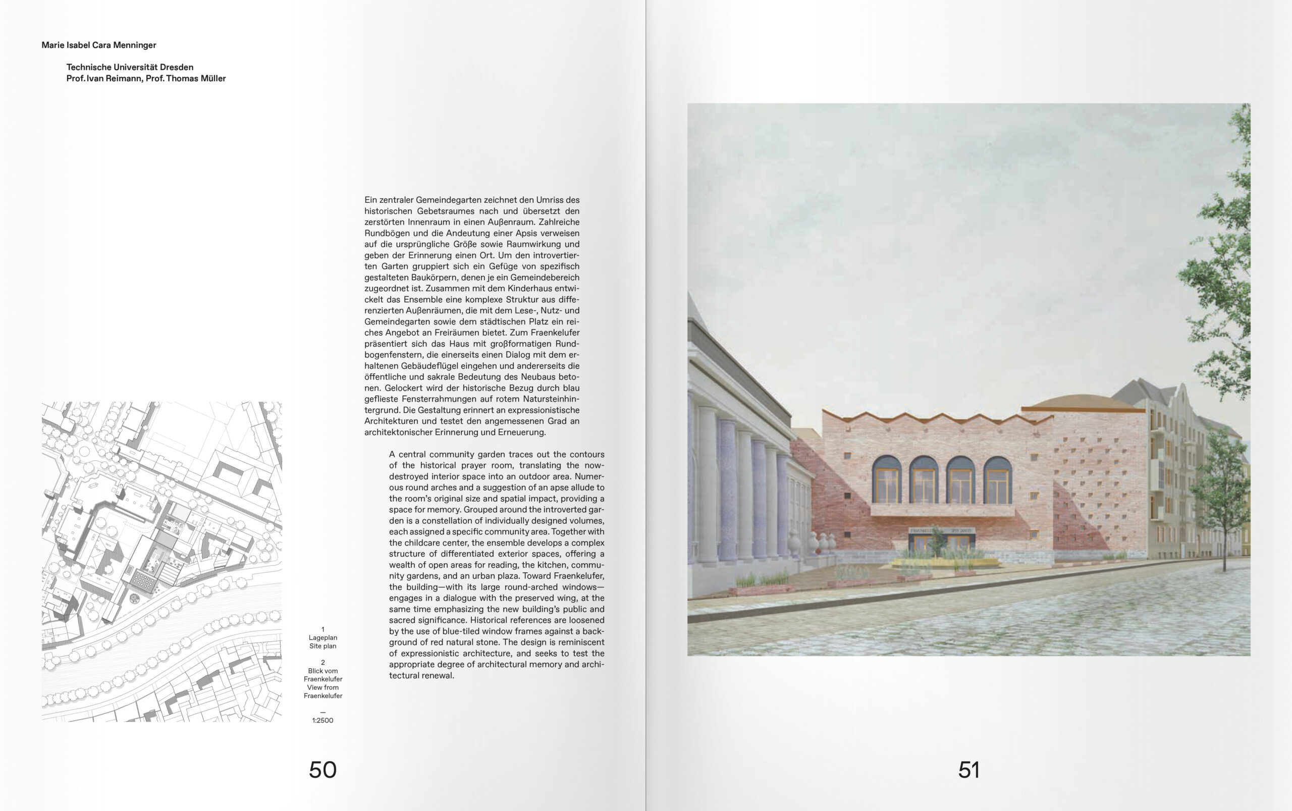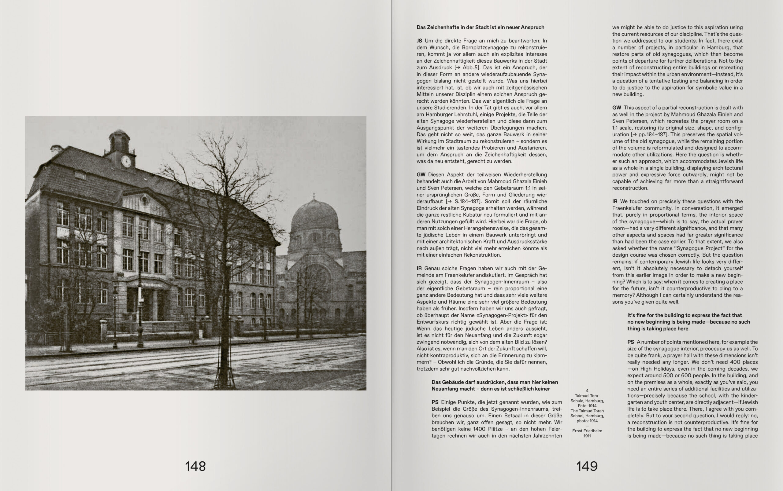 Präsentiert werden darin ausgewählte Entwürfe von Studierenden der vier Universitäten für neue Synagogenbauten am Fraenkelufer in Berlin sowie am Joseph-Carlebach-Platz und in der Poolstrasse in Hamburg. Sie illustrieren die Suche nach einem baulichen Ausdruck, der jüdischem Leben in Deutschland künftig Raum geben kann. In persönlichen Gesprächen erläutern Vertreter der jüdischen Gemeinden sowie Franz-Josef Höing als Oberbaudirektor der Stadt Hamburg ihre Sicht auf Vergangenheit und Zukunft der Synagogen in Hamburg und Berlin. Mit Mirjam Wenzel, Leiterin des Jüdischen Museums in Frankfurt, Salomon Korn, vormals Vizepräsident des Zentralrats der Juden in Deutschland, sowie dem Rabbiner Edward van Voolen und dem Schweizer Architekten Roger Diener kommen weitere Stimmen zu Wort und diskutieren Geschichte und Bedeutung der Synagogen in deutschen Städten als Orte religiösen jüdischen Lebens und jüdischer Kultur.