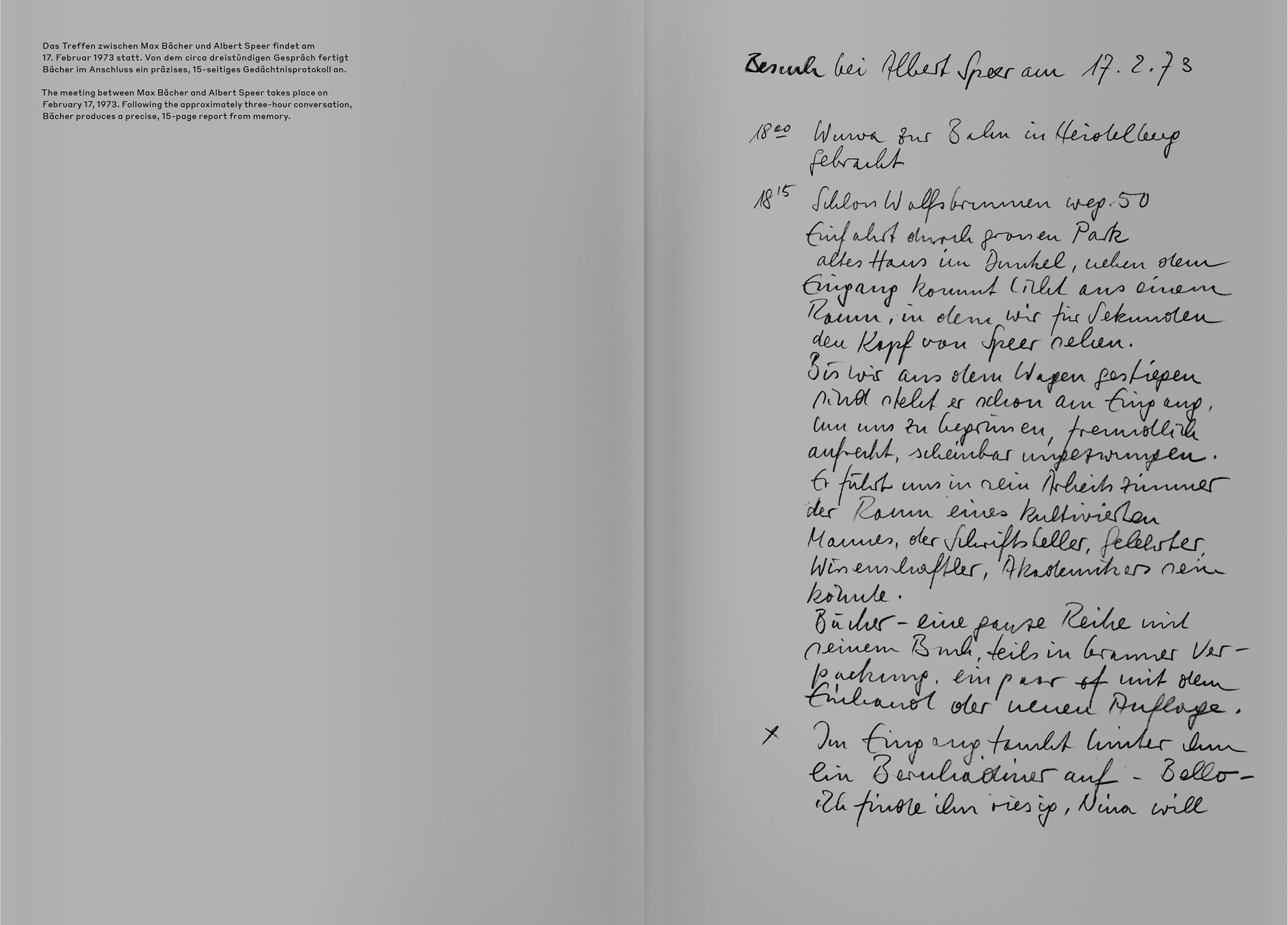 Der Architekt, Hochschullehrer, Juror und Kritiker Max Bächer traf 1973 auf Albert Speer, den Architekten, NS-Rüstungsminister und verurteilten Kriegsverbrecher. Das bisher unveröffentlichte Protokoll dieser Begegnung ist für Frederike Lausch der Ausgangspunkt, Max Bächers intensive Beschäftigung mit der Architektur im Faschismus zu analysieren. Bächer hielt ab 1971 mehrere Vorträge zur Architektur der NS-Zeit, in denen er auch vor den Gefahren gegenwärtiger faschistischer Tendenzen warnte. Das Gespräch mit Albert Speer mündete in eine scharf formulierte Abrechnung, nachdem dieser 1978 seine Entwürfe ohne Selbstkritik als Bildband veröffentlicht hatte. Als Speers Buch Mitte der 1980er Jahre erneut debattiert wird, fordert Bächer eine ideologiefreie Diskussionskultur ein.