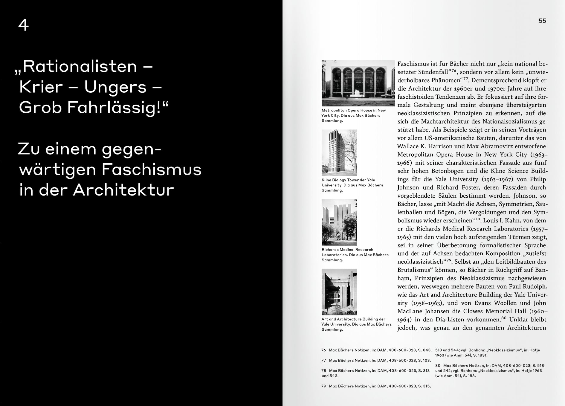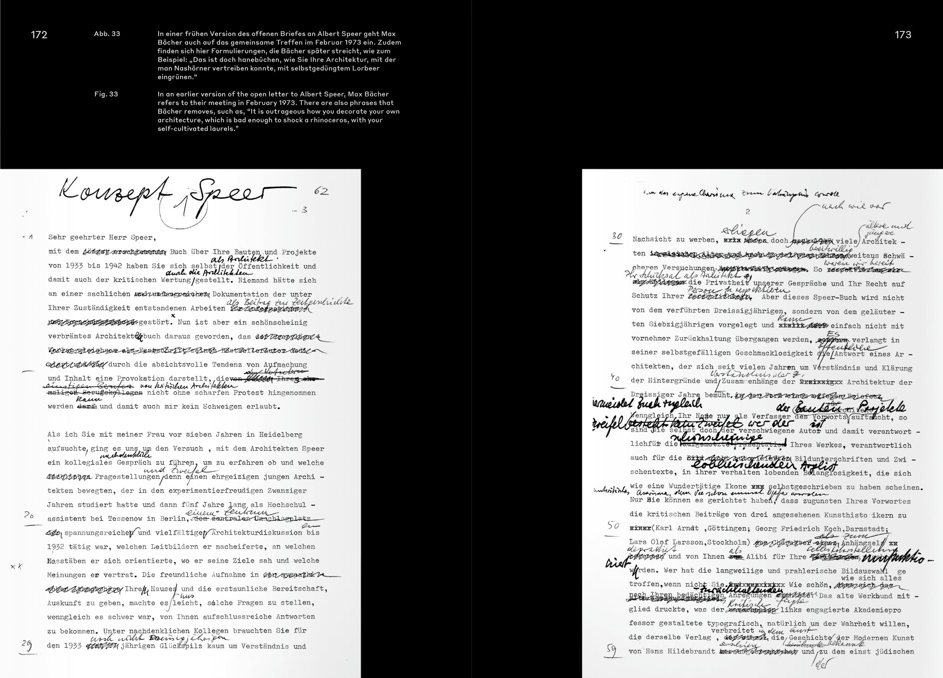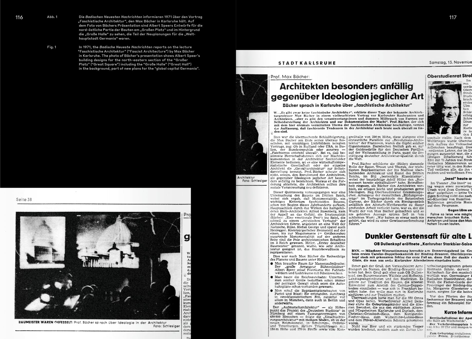 In 1973, Max Bächer, architect, university professor, juror and critic, met Albert Speer, architect, former Nazi Armaments Minister and convicted war criminal. Frederike Lausch has taken the previously unpublished record of that meeting as the starting point to analyse Max Bächer’s intensive study of the relationship between architecture and Fascism. From 1971 onwards, Bächer presented several lectures on the architecture of the National Socialist period, in which he also warned of the dangers of contemporary Fascist tendencies. In 1978, the dialogue with Albert Speer ended with a strongly worded condemnation by Bächer, after Speer had published his designs in an illustrated book completely lacking in self-criticism. When Speer’s book was again debated in the mid-1980s, Bächer called for an ideology-free culture of discourse.
