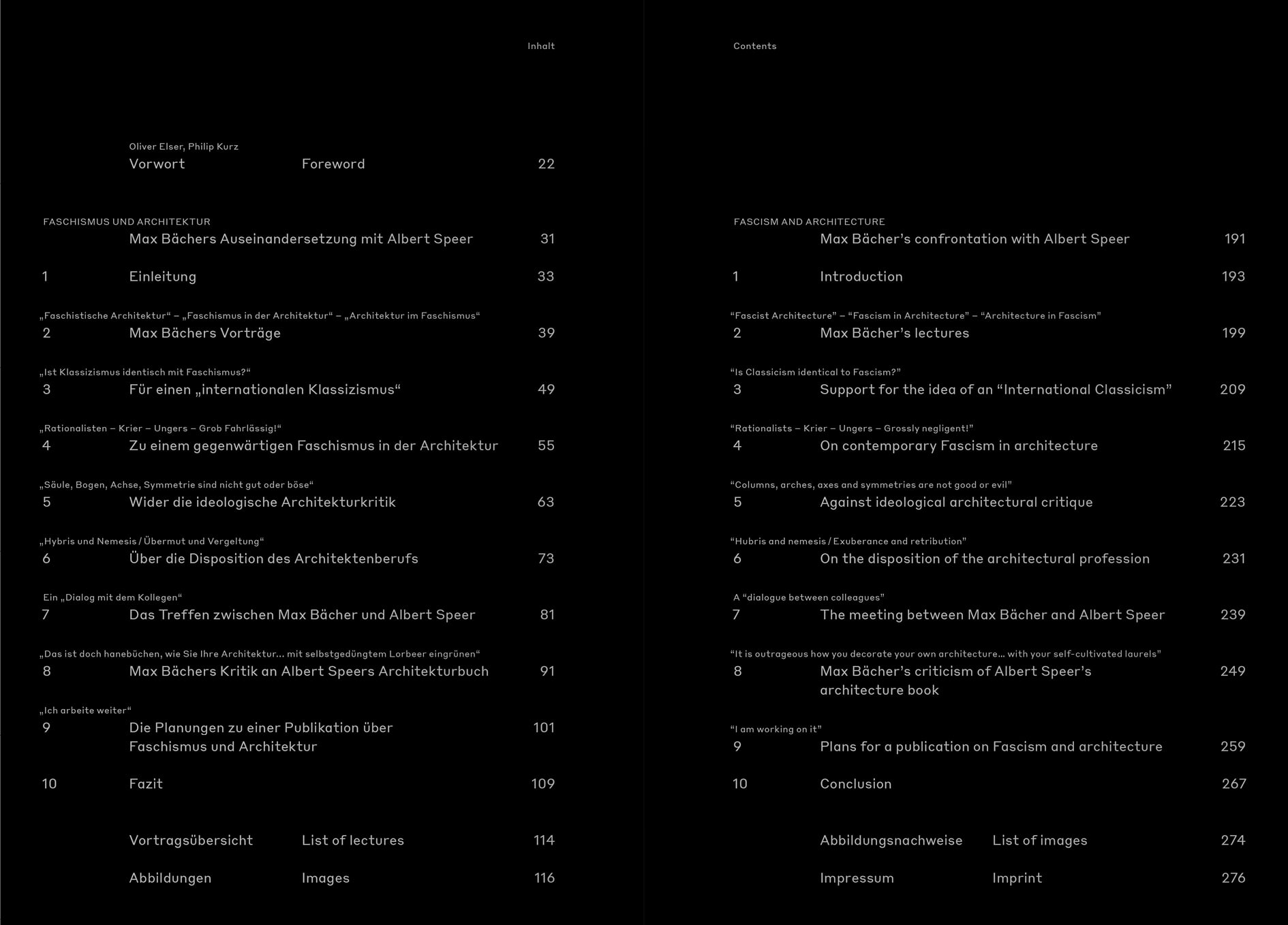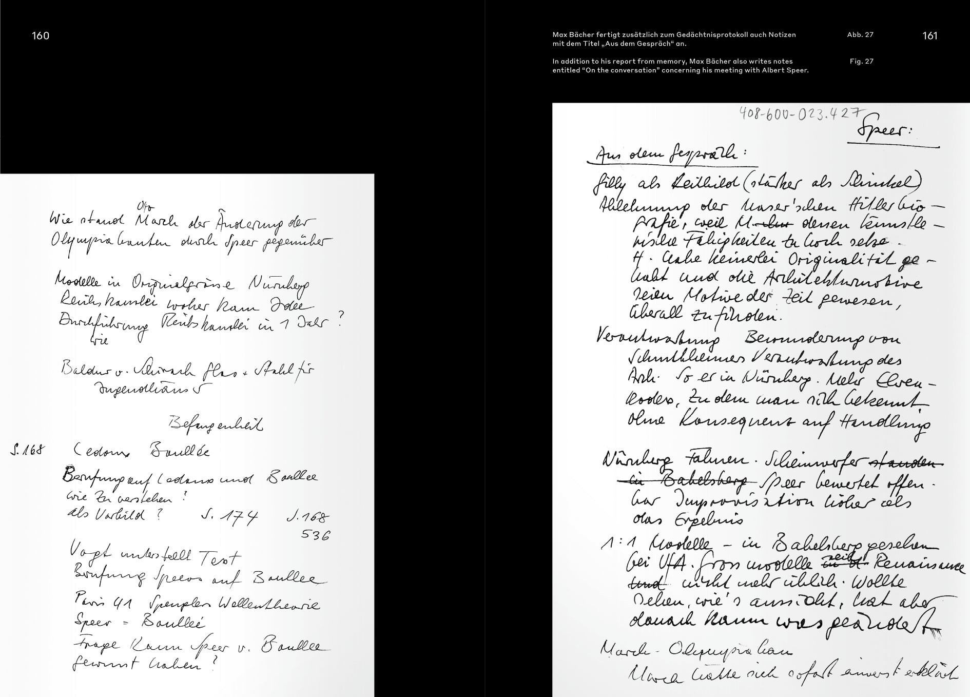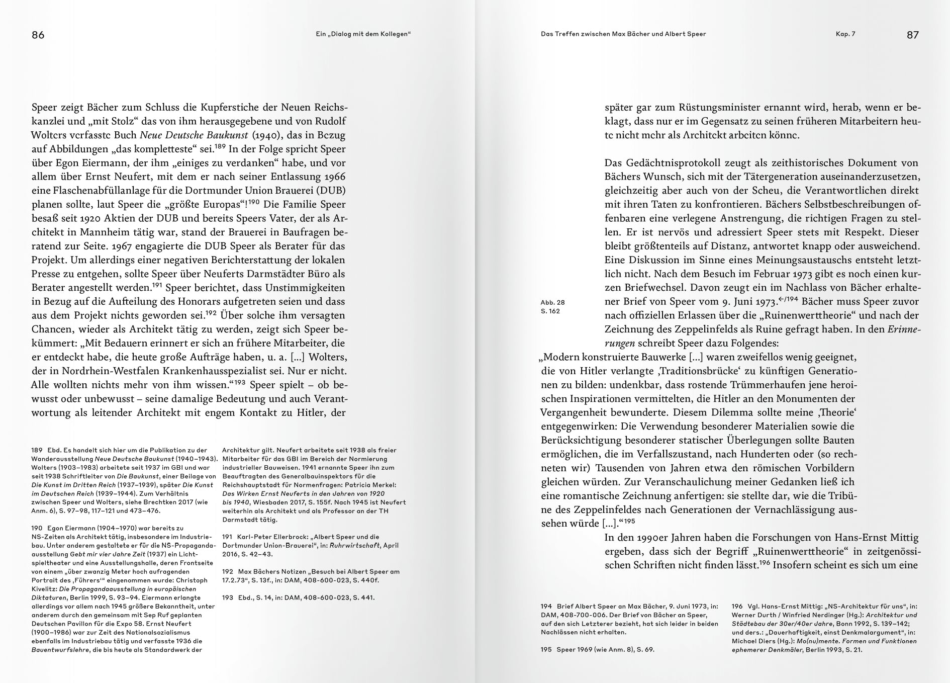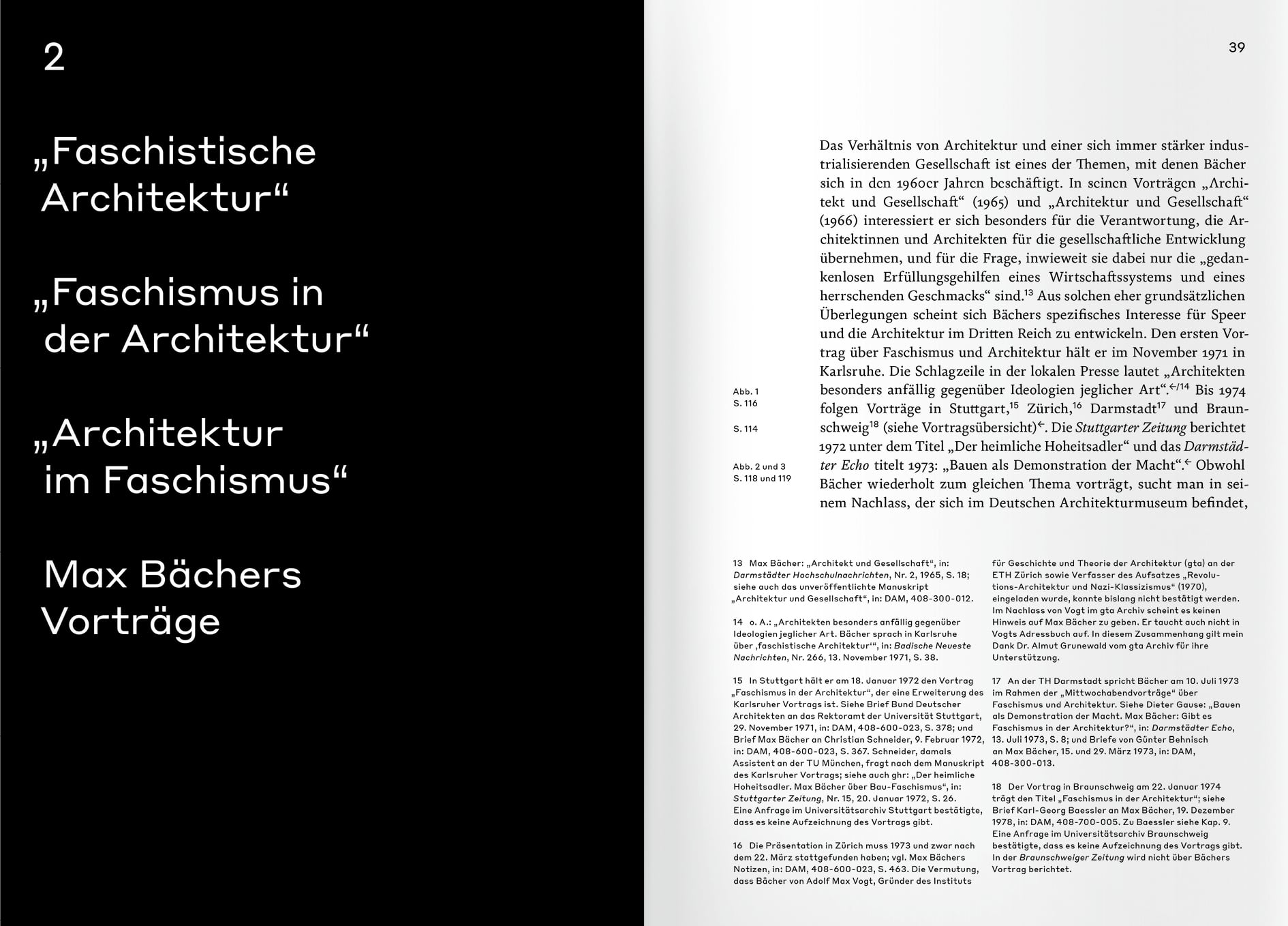 In 1973, Max Bächer, architect, university professor, juror and critic, met Albert Speer, architect, former Nazi Armaments Minister and convicted war criminal. Frederike Lausch has taken the previously unpublished record of that meeting as the starting point to analyse Max Bächer’s intensive study of the relationship between architecture and Fascism. From 1971 onwards, Bächer presented several lectures on the architecture of the National Socialist period, in which he also warned of the dangers of contemporary Fascist tendencies. In 1978, the dialogue with Albert Speer ended with a strongly worded condemnation by Bächer, after Speer had published his designs in an illustrated book completely lacking in self-criticism. When Speer’s book was again debated in the mid-1980s, Bächer called for an ideology-free culture of discourse.