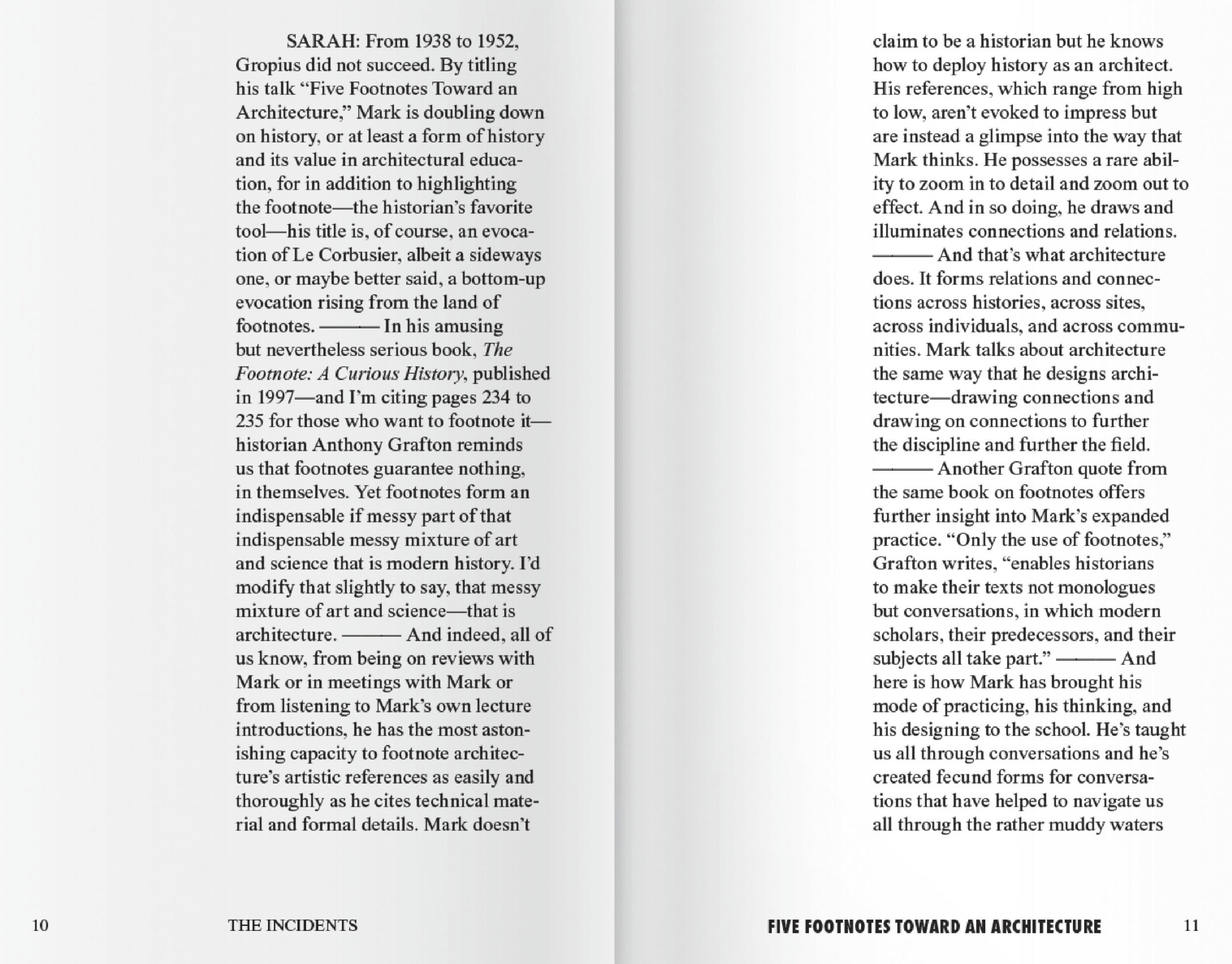 On the occasion of his fifth and final year as Chair of the Department of Architecture at the Harvard University Graduate School of Design, architect and educator Mark Lee strings together five “footnotes” — on history, on cadence, on autonomy, on America, and on point — to assess the relationship between architectural education, research, and professional practice. Evoking a similar position that marked his tenure, Lee delivers a lecture that embraces dialogue, context, and precedent, and rejects the notion of a heroic manifesto in favor of the footnote: “something ancillary, something used for referencing and providing citations for metanarratives that already exist.” And why five? “It’s a ubiquitous number in the culture of architecture. Five orders, five architects, five points.”