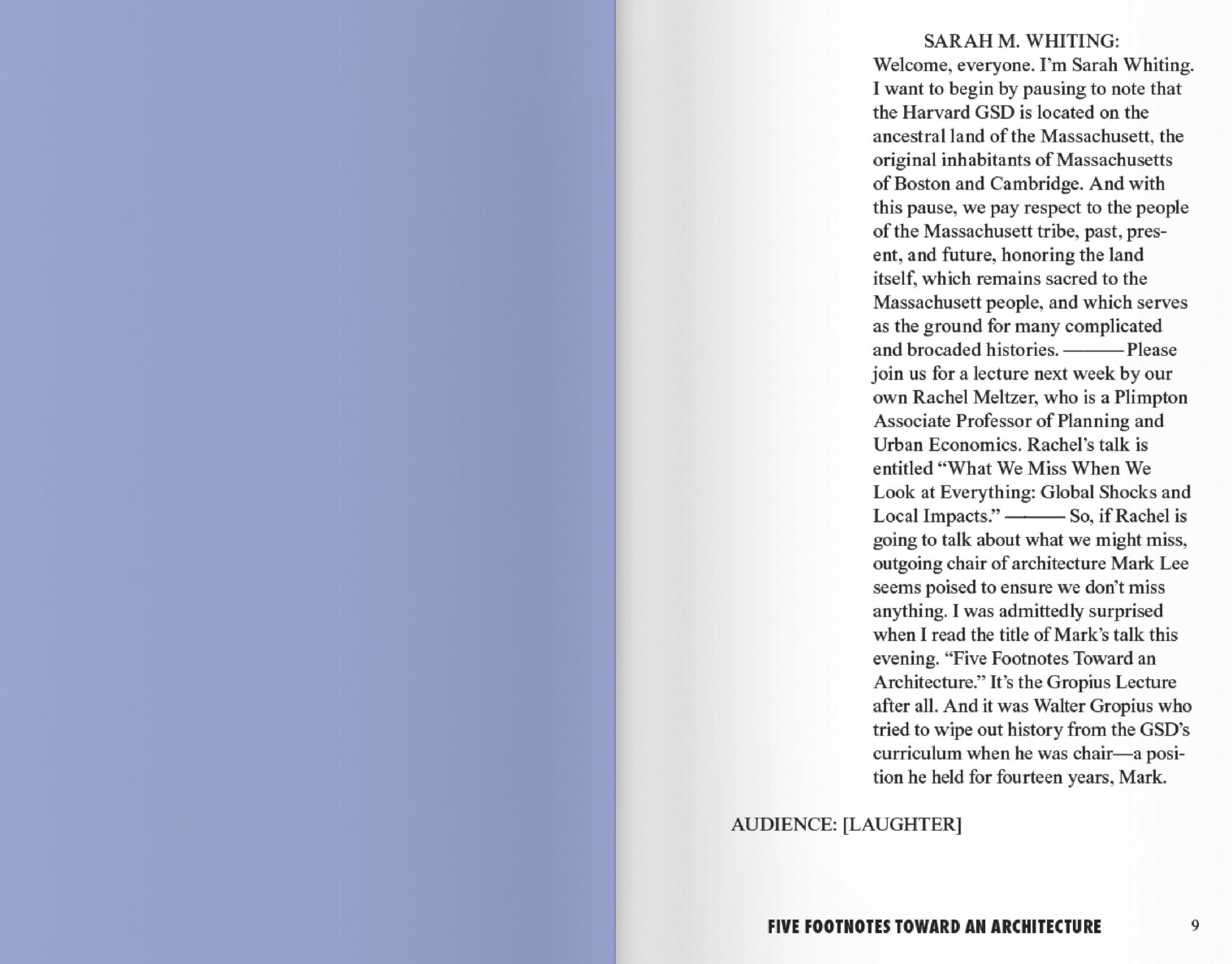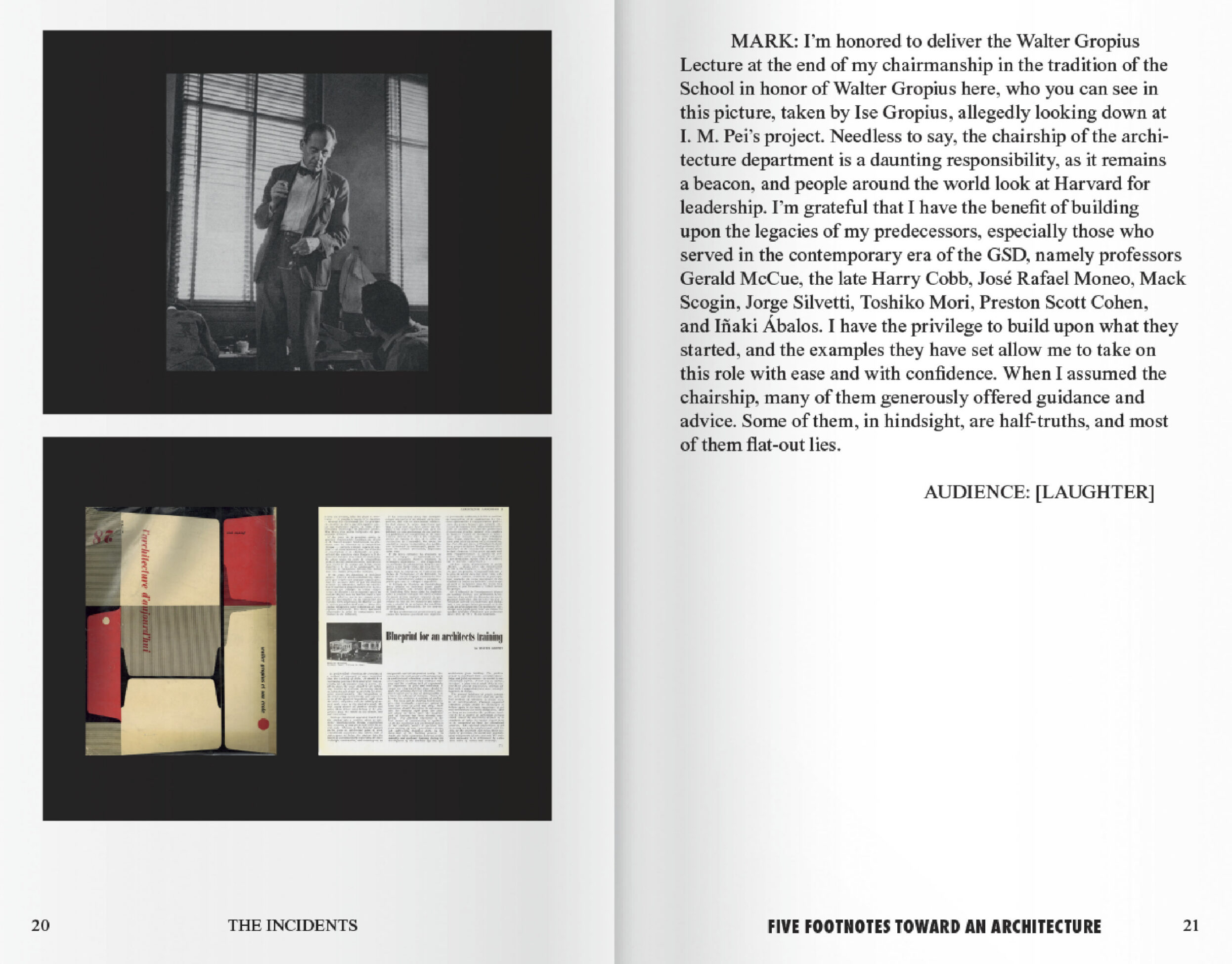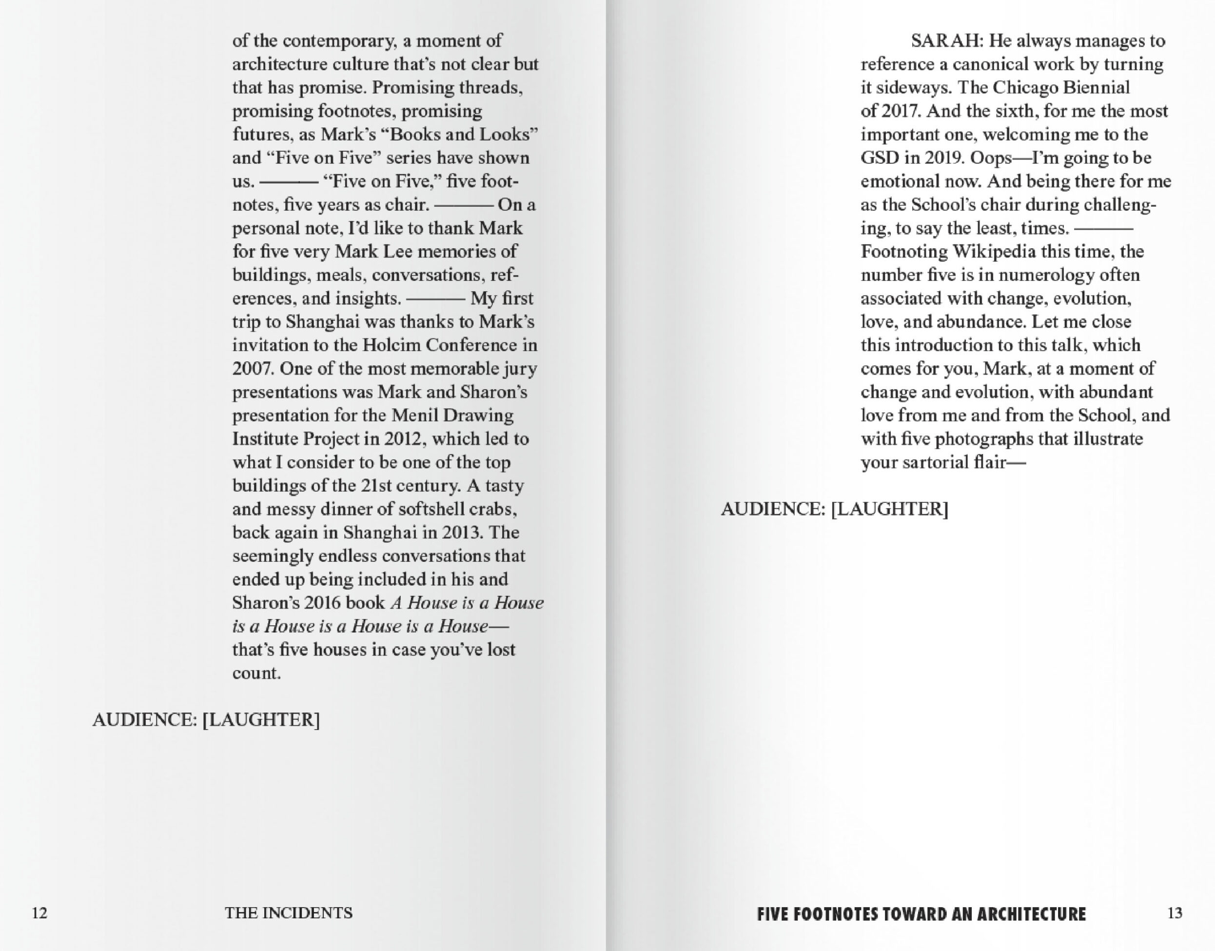 Anlässlich seines fünften und letzten Jahres als Vorsitzender des Fachbereichs Architektur an der Harvard University Graduate School of Design reiht der Architekt und Lehrer Mark Lee fünf „Fußnoten“ aneinander – zu Geschichte, Rhythmus, Autonomie, Amerika und auf den Punkt –, um die Beziehung zwischen Architekturausbildung, Forschung und beruflicher Praxis zu bewerten. In Anlehnung an eine ähnliche Position, die seine Amtszeit geprägt hat, hält Lee einen Vortrag, der Dialog, Kontext und Präzedenzfälle einbezieht und die Idee eines heroischen Manifests zugunsten der Fußnote ablehnt: „etwas Nebensächliches, etwas, das als Referenz und Quelle für bereits existierende Metanarrative dient“. Und warum fünf? „Es ist eine in der Architekturkultur allgegenwärtige Zahl. Fünf Ordnungen, fünf Architekten, fünf Punkte.“