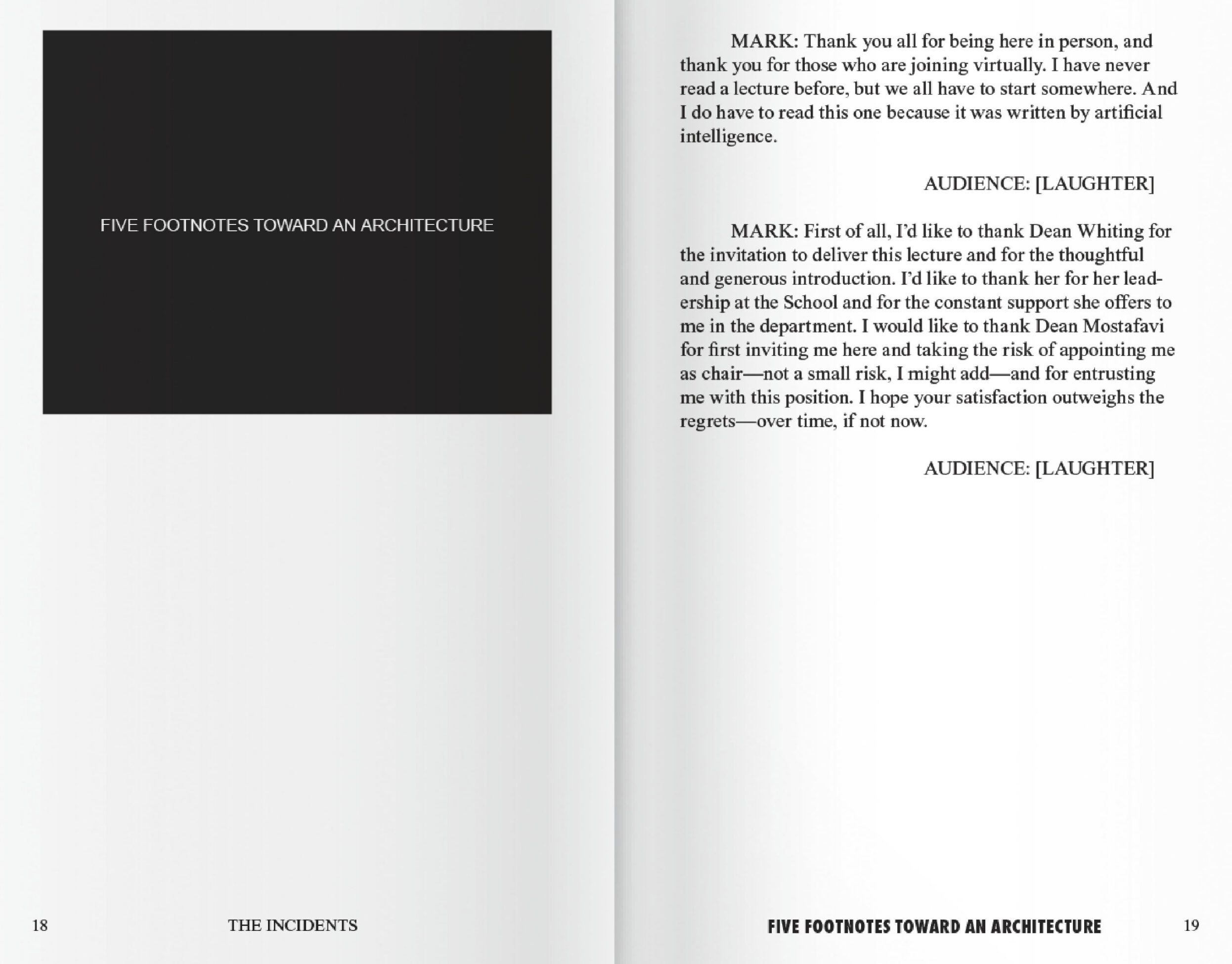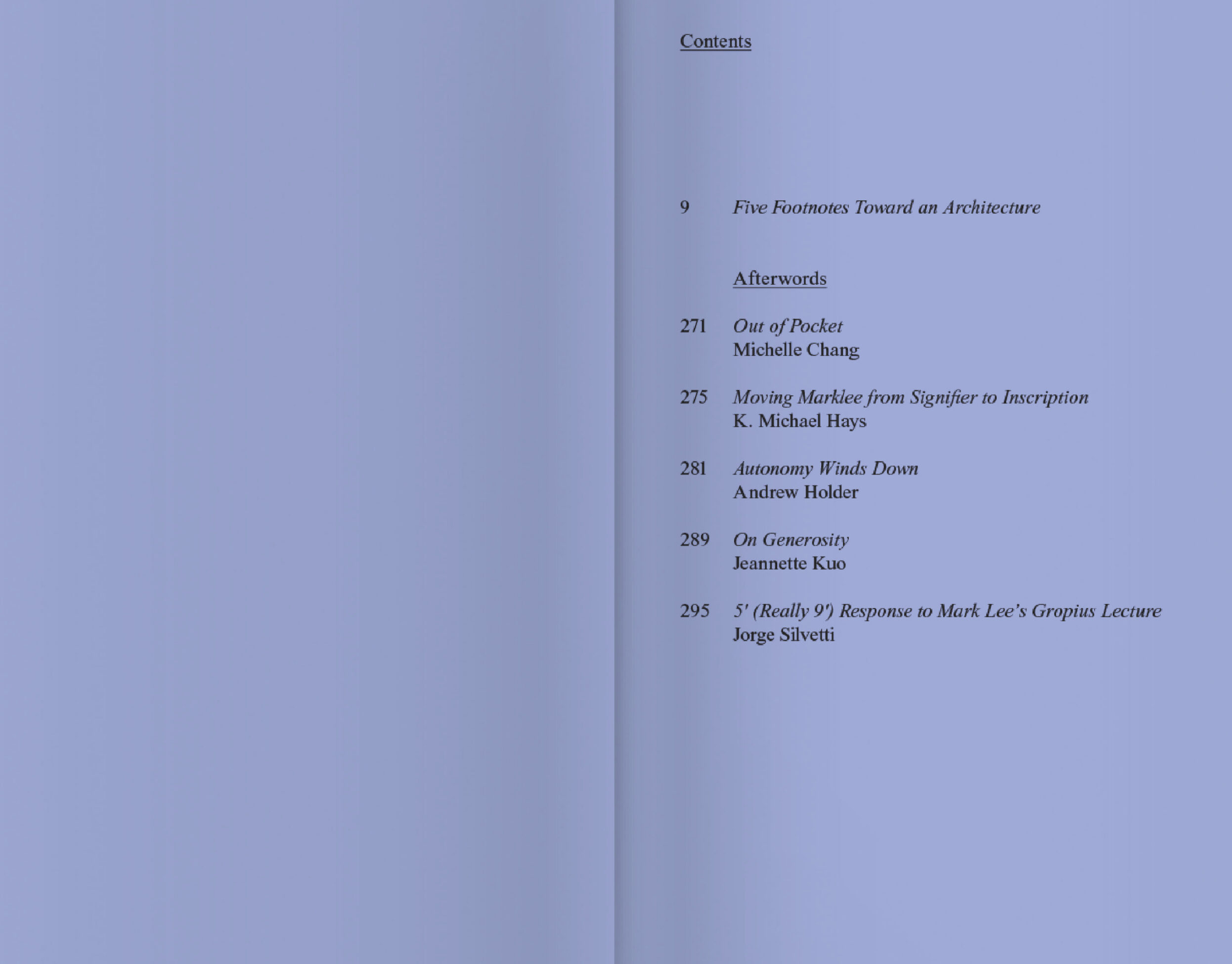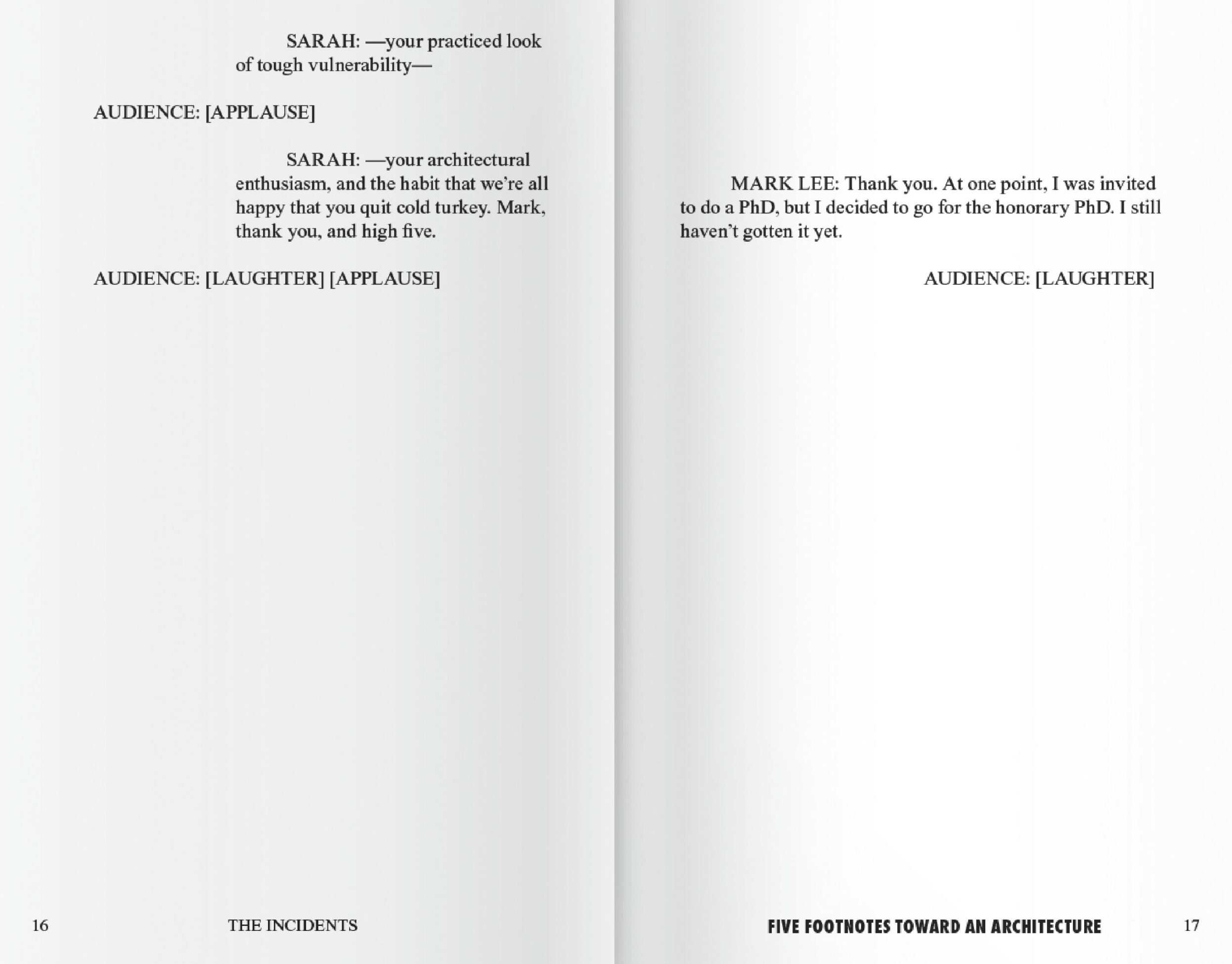 Anlässlich seines fünften und letzten Jahres als Vorsitzender des Fachbereichs Architektur an der Harvard University Graduate School of Design reiht der Architekt und Lehrer Mark Lee fünf „Fußnoten“ aneinander – zu Geschichte, Rhythmus, Autonomie, Amerika und auf den Punkt –, um die Beziehung zwischen Architekturausbildung, Forschung und beruflicher Praxis zu bewerten. In Anlehnung an eine ähnliche Position, die seine Amtszeit geprägt hat, hält Lee einen Vortrag, der Dialog, Kontext und Präzedenzfälle einbezieht und die Idee eines heroischen Manifests zugunsten der Fußnote ablehnt: „etwas Nebensächliches, etwas, das als Referenz und Quelle für bereits existierende Metanarrative dient“. Und warum fünf? „Es ist eine in der Architekturkultur allgegenwärtige Zahl. Fünf Ordnungen, fünf Architekten, fünf Punkte.“