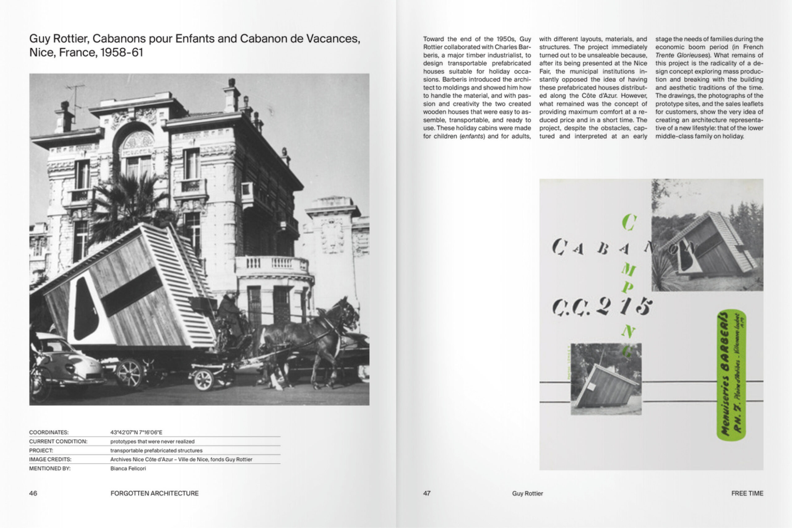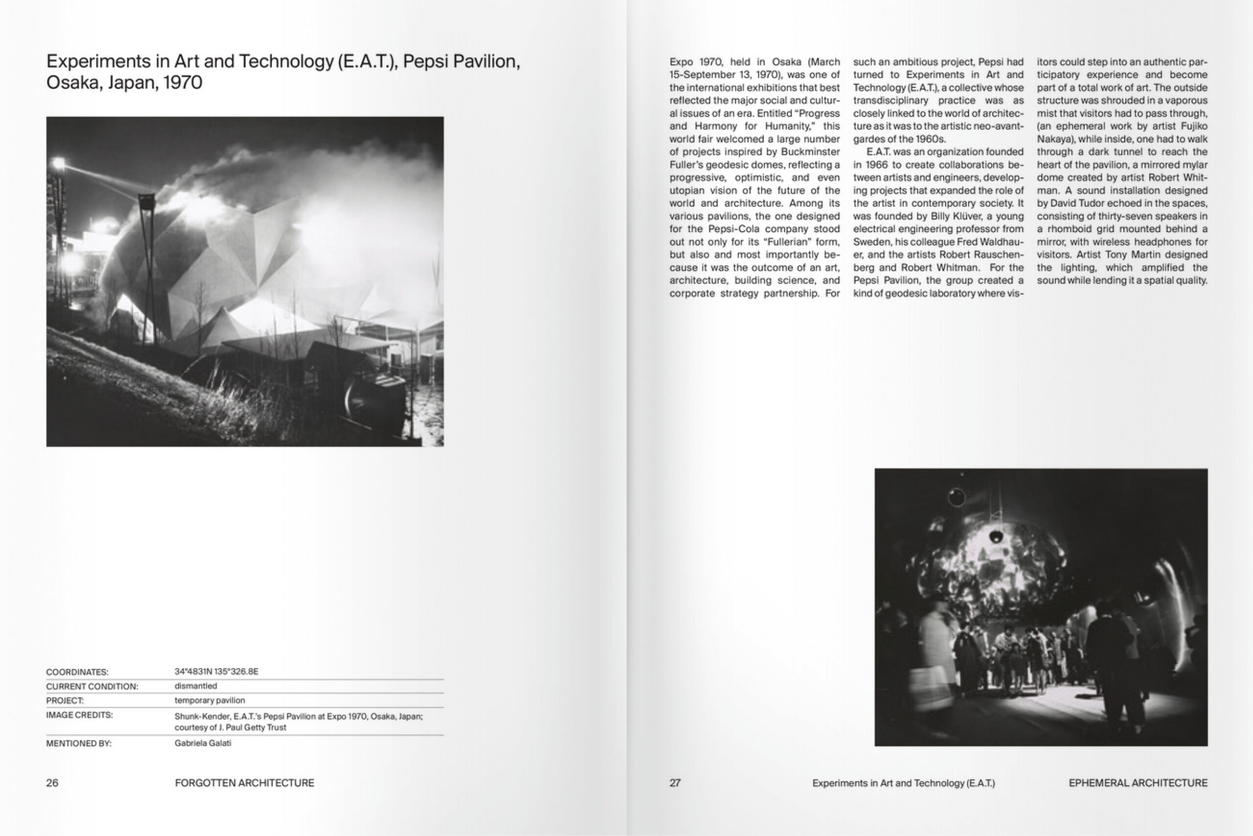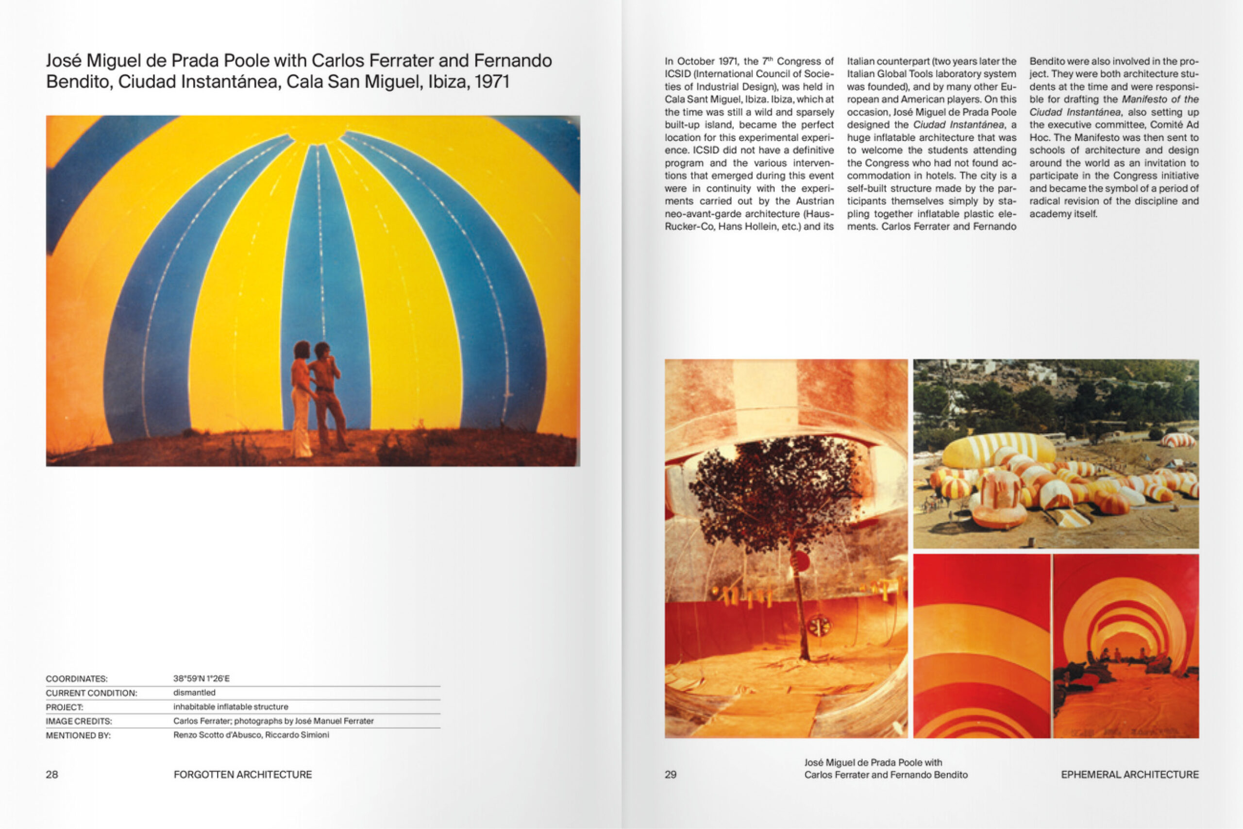 Several forgotten projects by well renowned architects, such as the house designed for Arnaldo Pomodoro by Ettore Sottsass Jr. and the avant-garde Binishells by Dante Bini, are published exclusively in the book, alongside drive-in churches, flying houses, psychedelic inflatable architectures, etc.