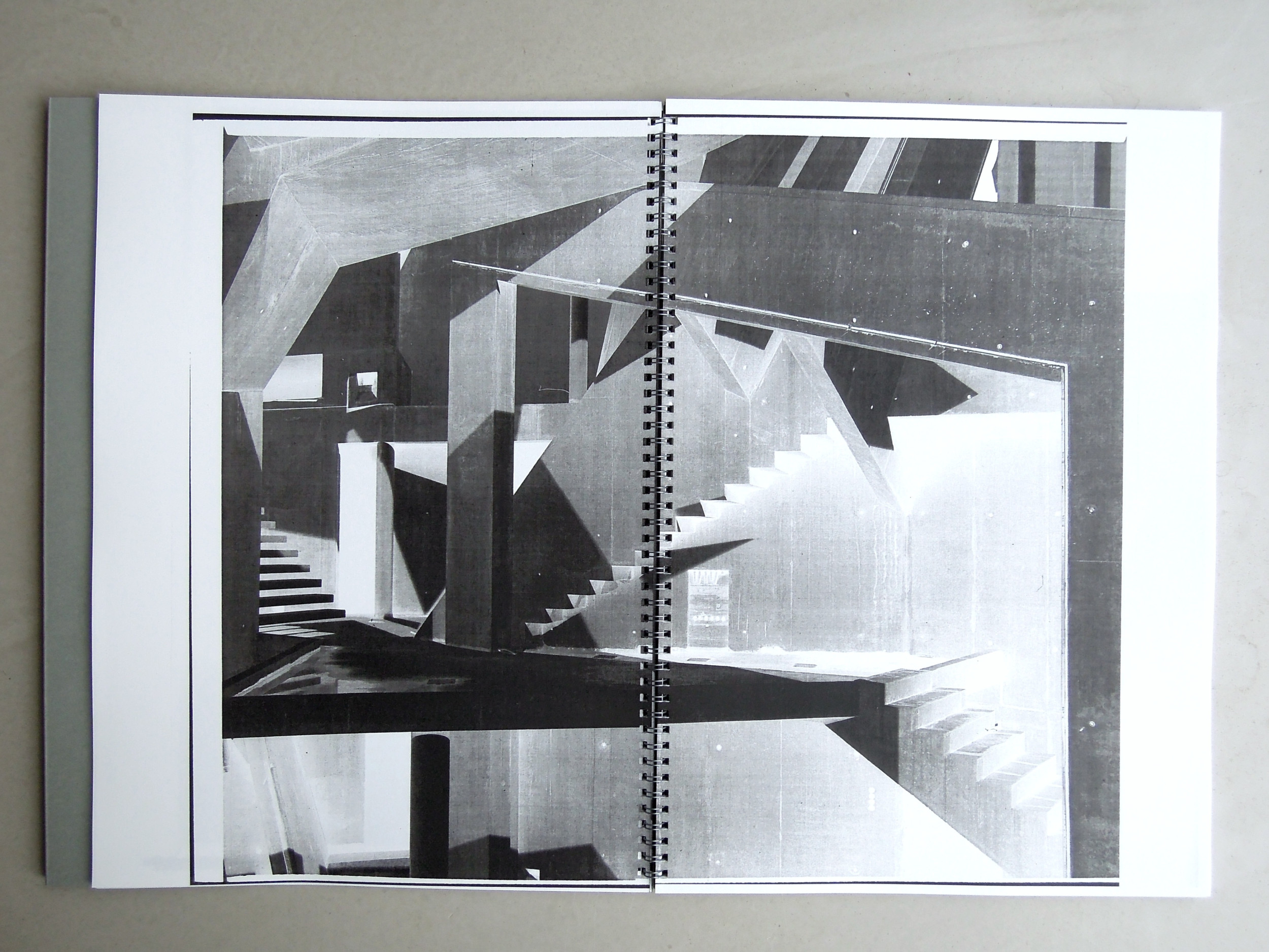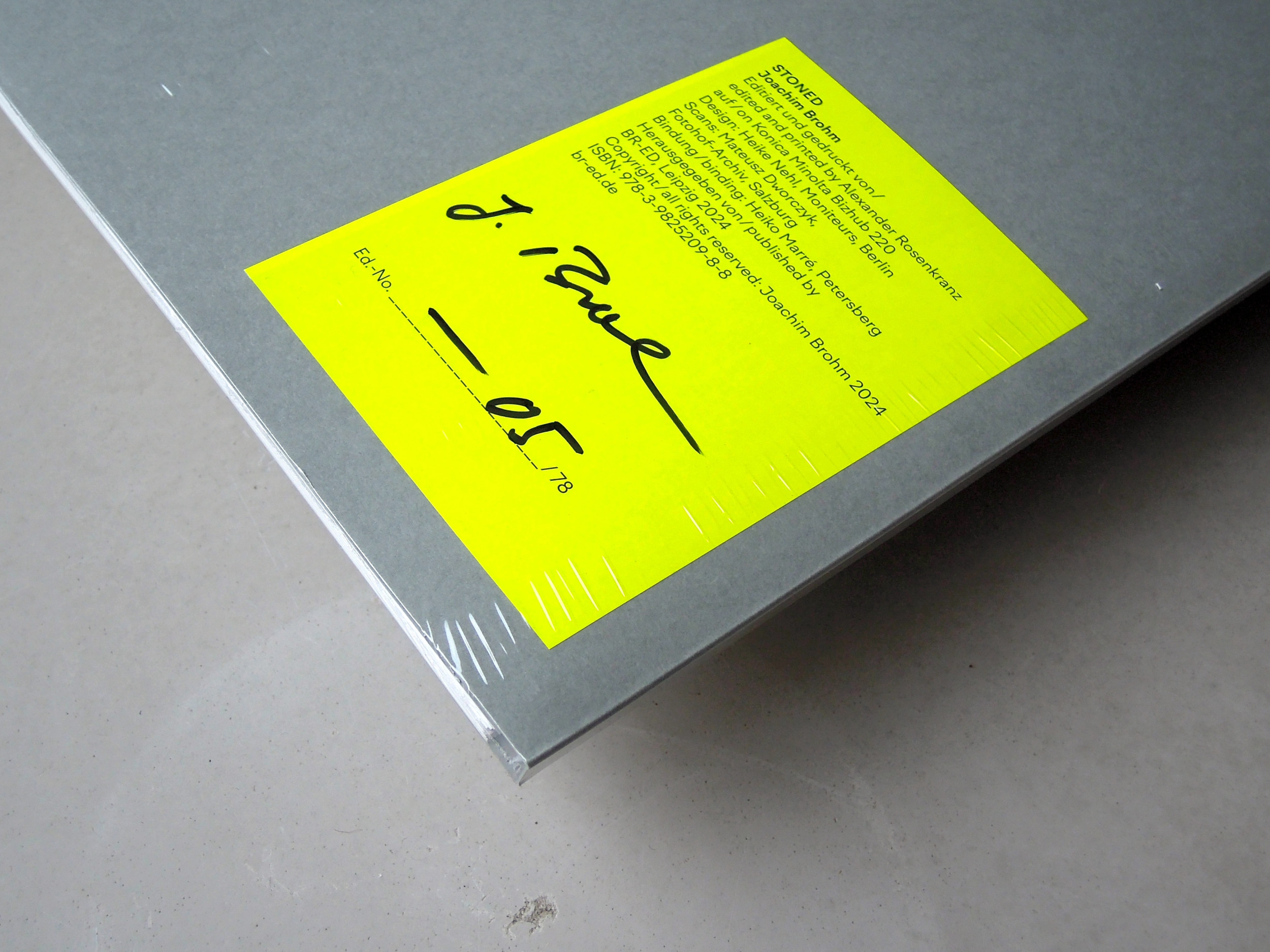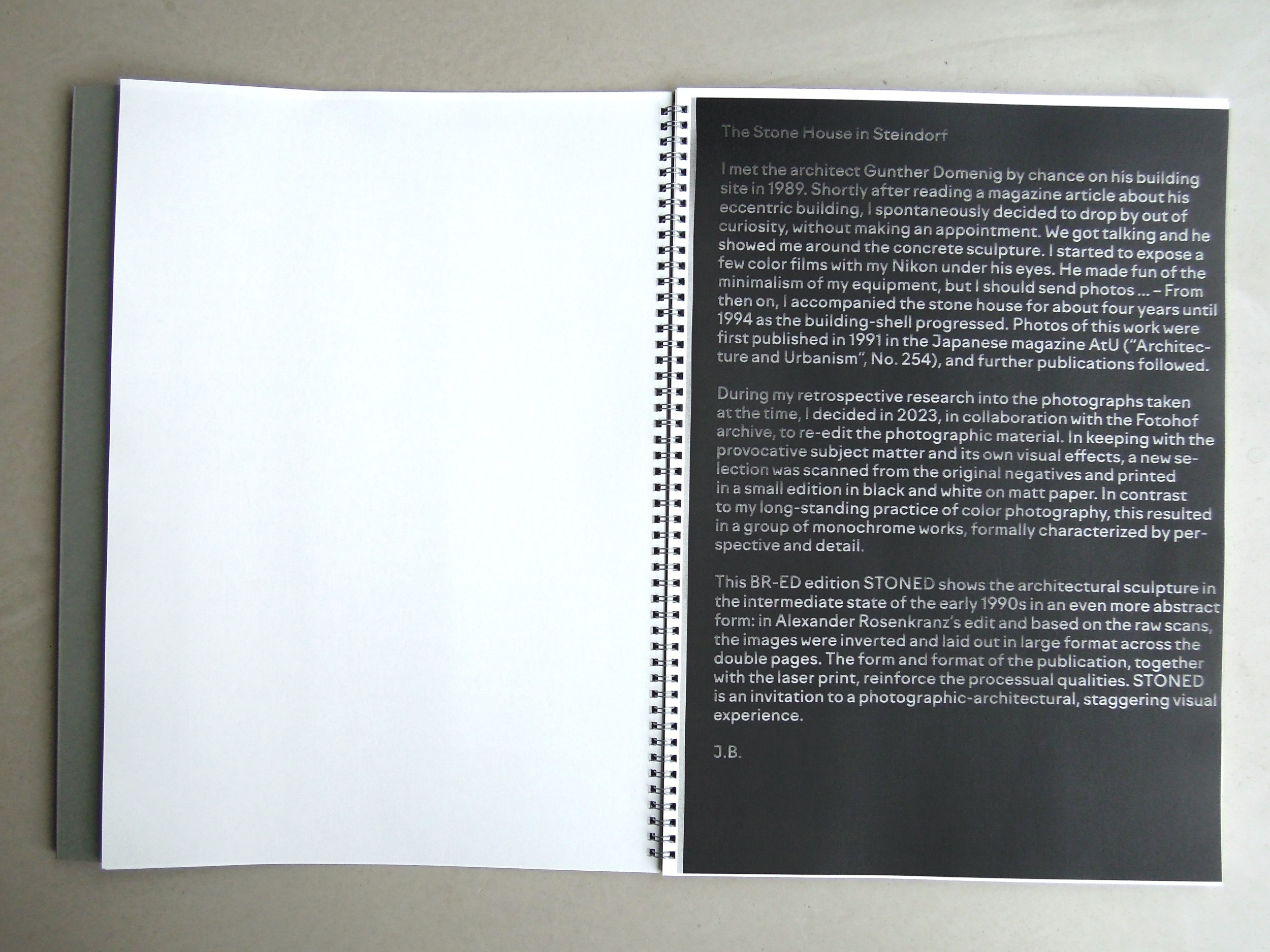 This BR-ED edition STONED shows the architectural sculpture in the intermediate state of the early 1990s decidedly abstract: in Alexander Rosenkranz’s edit and based on the raw scans, the images were inverted and laid out in large format across the double pages. The form and format of the publication, together with the laser print, reinforce the processual qualities. STONED is an invitation to a photographic -architectural, staggering visual experience.