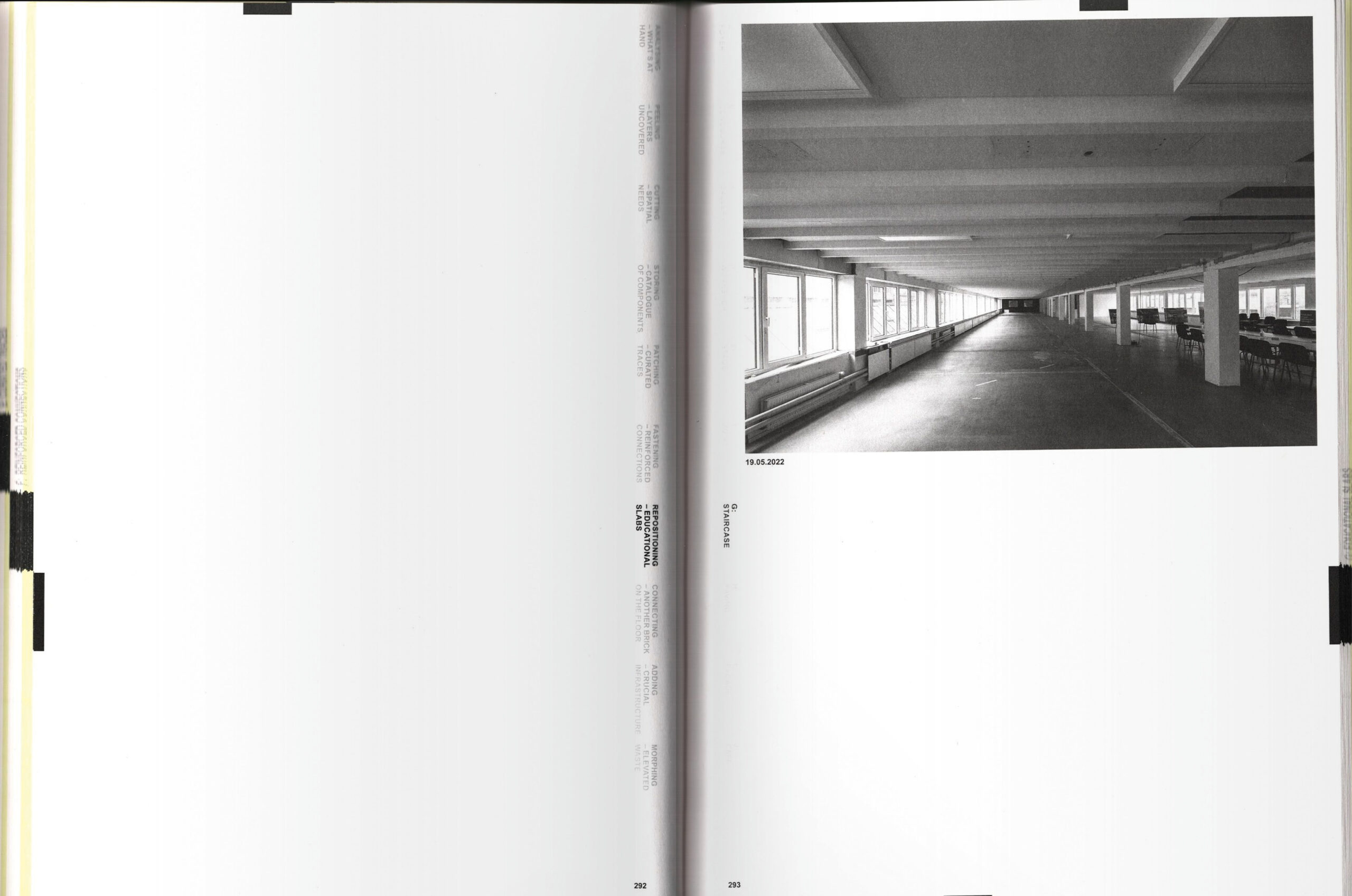 Das Buch befasst sich eingehend mit den Methoden des Projekts und beschreibt detailliert Materialänderungen und räumliche Umgestaltungen, die die Anpassung des Gebäudes im Laufe der Zeit verdeutlichen. Das physische Design des Buches selbst unterstreicht diese Themen, indem es verschiedene Papiersorten verwendet, um verschiedene Dokumentationsmethoden zu überlagern, darunter 3D-Scans, systematische Verfolgung und Kategorisierung aller im und um den Pavillon gefundenen Baumaterialien, Renovierungspläne und detaillierte technische Zeichnungen.