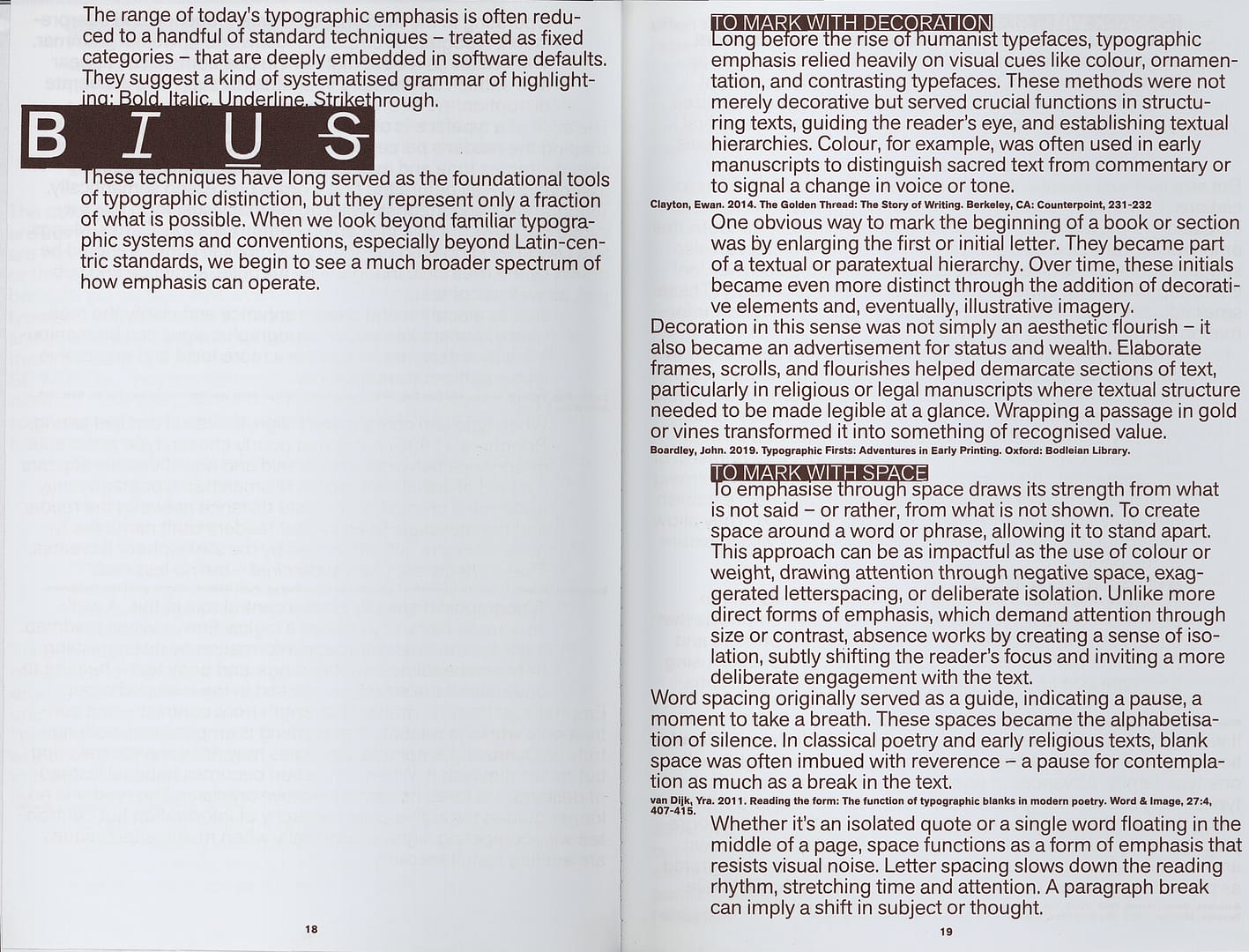 To Mark is to Mean untersucht, wie typografische Hervorhebungen nicht nur Aufmerksamkeit erzeugen, sondern auch Bedeutung, Tonalität und Interpretation der Texte mitgestalten. Die Publikation bringt historische Beispiele mit zeitgenössischen Arbeiten von 35 internationalen Designer*innen, Foundries und Studios zusammen, auch jenseits des lateinischen Schriftsystems, und formt so ein Archiv, das die Bandbreite und das noch nicht ausgeschöpfte Potenzial typografischer Hervorhebung aufzeigt.