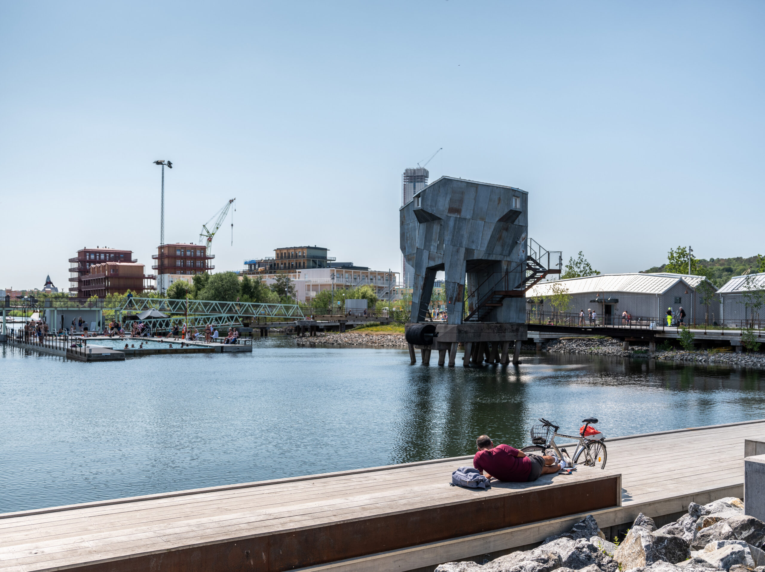 On the piers of Frihamnen, in central Gothenburg, a transformation from an industrial port to a lively neighborhood is underway. Jubileumsparken is part of Gothenburg’s 400th anniversary and a catalyst for ongoing site and city development, it will be a destination. For several years, temporary activities such as baths, sauna, temporary parks and play structures have been built in Jubileumsparken. This is urban development in constant citizen dialogue. A thriving park landscape has gradually been created in an asphalt desert together with the public.